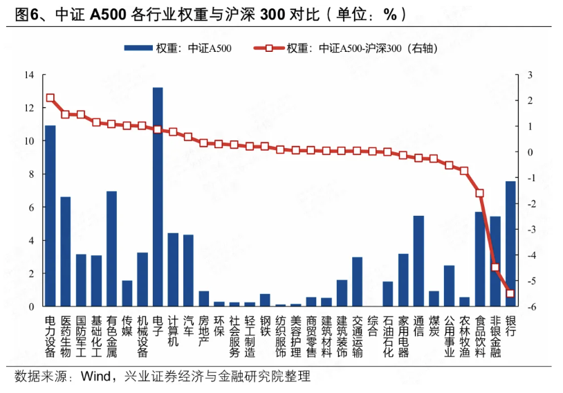 另一方面,中证A500指数通过在各个行业内优选龙头上市企业、行业配置均衡,成为各类投资者年末布局的理想工具。 行业影响上,对比沪深300,中证A500超配电力设备、医药、军工、化工、有色较多。中证A500配置电子、电力设备、银行、有色金属、医药生物居前,对比沪深300超配电力设备、医药、军工、化工、有色较多。