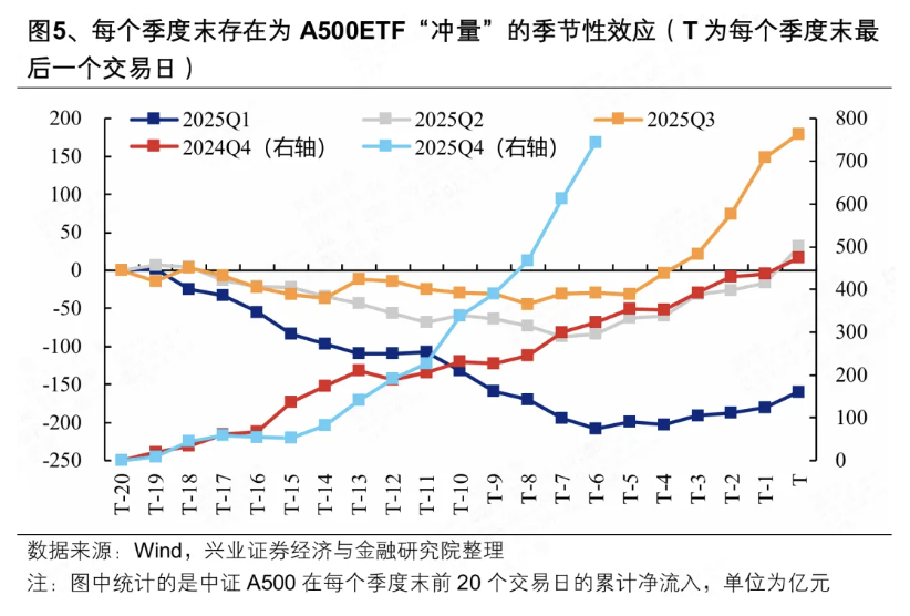 12月以来A500ETF大幅净流入的背后,一方面是季末“冲量”的“日历效应”。历史上看,A500ETF在季度末存在“冲量”的规律,临近季末的时段基本都是A500ETF大幅净流入的核心窗口。