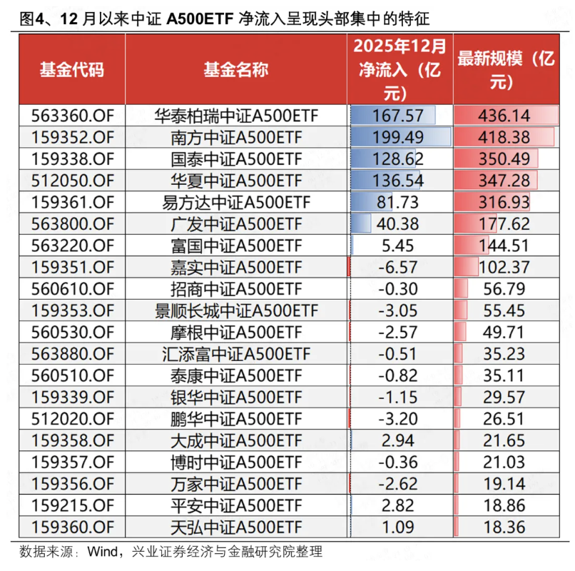 此外,本轮A500ETF净流入呈现头部集中的特征。市面上规模前六大A500ETF产品几乎承接了12月以来所有的净流入,部分规模较小的产品反而有小幅净流出。