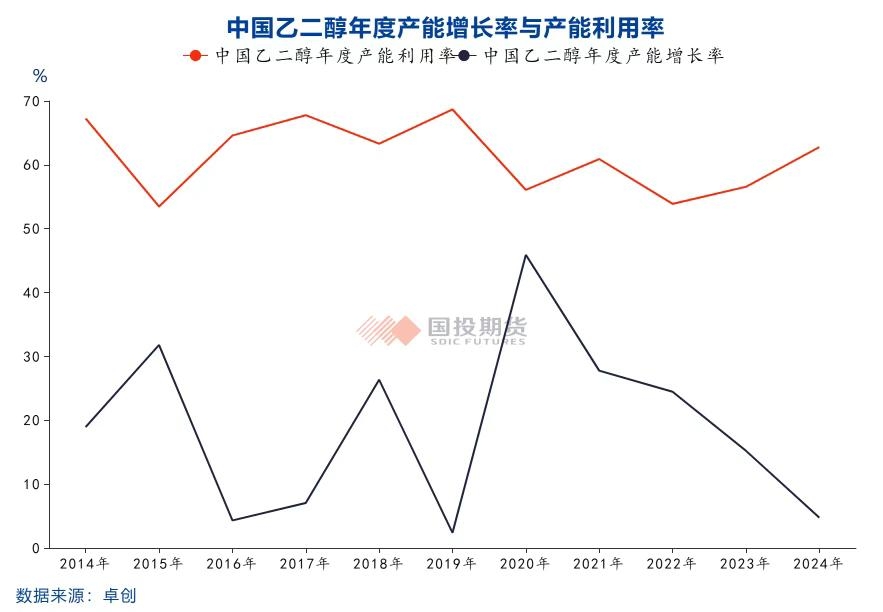 | 8月底以来,乙二醇期价从4500元/吨附近一路下跌,昨日大幅下跌,逼近3600元/吨关口。4个月的下跌行情中,9月-10月主要因旺季推迟及油价走弱,期间PTA和乙二醇同步下跌;10月下旬以来,双十一订单显现带来需求回暖,PTA价格走强,但乙二醇继续下跌,分化主要来自供应。乙二醇新产能投产叠加产能利用率高,港口及社会库存同步增长,且新年度乙二醇依旧面临较大的新装置投产压力,行业利润同步下滑,基差也在走弱。可见,供应增长是乙二醇本轮价格不断走弱的主要因素。 日内乙二醇盘面大幅减仓反弹,相比昨日呈现出冰火两重天的差异。对于后市行情如何演绎,底部如何确认,从目前的基本面很难找到反转的因素。从K线图上看,3600元/吨一线或有支撑,但在乙二醇一路下行的过程中,技术支撑显得尤为乏力。中长线看,供应增长,效益下滑,产能利用率的收缩成为必然,在供应量收缩的过程中逐渐寻找平衡。 1、高投产带来利润和产能利用率的下滑 从历史表现看,2020年至2022年连续三年的高速投产叠加公共卫生事件的扰动,乙二醇行业经历了效益的大幅走低伴随产能利用率的极度萎缩,2020年至2023年连续4年产能利用率不足60%;其中合成气法年度负荷最低不足50%,乙烯法产能利用率最低在60%以下。2023年之后,产能增速自高位回落,行业产能利用率和效益同步回升。可见在高投产、低利润的年份,乙二醇往往需要通过产能利用率的下降来缓和过剩压力。