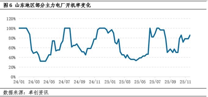 需求端对市场支撑先强后明显减弱 四季度需求端对市场支撑强度先强后明显减弱,具体来看:11月中旬之前,由于恰逢国内迎峰度冬用煤高峰季补库阶段,电力行业提库需求持续释放,对高价接受度也有所提升,非电行业则满足刚需为主,而由于市场价格整体偏强,贸易商在买涨不买跌情绪带动下,对迎峰度冬期间行情信心充足,投机囤煤需求较多,需求端对市场存在明显支撑,煤价持续上涨,不断刷新年内新高;而进入11月下旬后,由于煤价刷新年内新高后,增加下游对高价的抵触情绪,同时市场预期的“冷冬”天气并未出现,且局部区域较去年同期气温偏高,电厂负荷提升迟缓,电厂库存累积较快,贸易商认为高价可持续性不强,去库锁定利润需求不断增长,需求端对市场支撑减弱,煤价承压松动,同时港口、坑口煤价联动下行,且降幅较大,更加重市场参与者观望情绪,市场成交更显冷清。据卓创资讯统计数据显示,截至12月18日,山东地区主流电厂开机率为85.71%,较去年同期开机率低14.29个百分点。