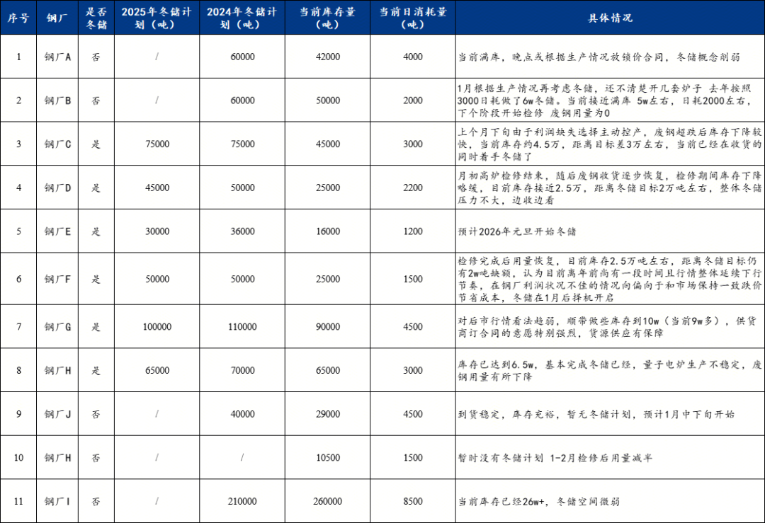 | 报告品种:螺纹钢 原文链接:https://mp.weixin.qq.com/s/a4cy4-JYcoueFHNz1NxHLg?scene=1&click_id=19 【调研背景】 2025岁末已至,江苏省入冬以来气温下降稍缓,给户外作业的诸多废钢基地带来一些利好条件,但废钢价格走势却给大家带来真切的“寒冬”体验,自11月以来,江苏废钢价格几度下跌,基地纷纷出货避险,钢厂到货和库存快速双增,在此情况下,今年江苏省钢厂还有废钢冬储计划吗?废钢加工基地又是作何打算?带着这两大问题,Mysteel江苏废钢小组对江苏省的钢厂和废钢加工企业进行了专项调研。 【钢厂现状】 从钢厂方面来看,在调研的11家样本钢厂中,有6家钢厂明确表示要做冬储计划,约占比55%,其余5家钢厂则不固定制作该计划,而是随用随采,且当下库存供应尚且充足,后续也存在年前检修计划。调研显示,2025年计划冬储的钢厂数量和冬储计划量大多低于2024年,仅2家钢厂持平去年计划量,当前库存量和目标冬储量相差不大的钢厂基本上着眼于2026年1月份展开冬储。 当前样本钢厂的废钢库存可周转天数基本处于充足状态,根据调研数据测算得出,18.18%的钢厂可使用天数5-10天,36.36%的钢厂可使用天数10-15天,45.45%的钢厂可使用天数15天以上。