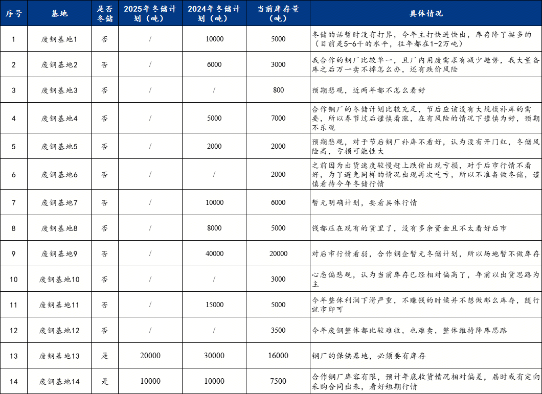 数据来源:我的钢铁网 【基地现状】 从废钢加工企业方面来看,企业心态明显比钢厂更显悲观,14家样本企业中仅2家计划冬储,占比约14.28%,冬储计划量基本跟随各自钢厂需求或者保供量而定;剩余12家样本企业直接不做冬储,占比约85.72%。 心态方面,基地端略显悲观,主要是今年钢材市场行情继续下行,废钢卖货难的同时收货也难,企业收货价格跌幅时常小于钢厂,利润受到极大压缩,企业经营积极性大大下降,年底出于资金压力考虑,整体仍以出货降库为主。