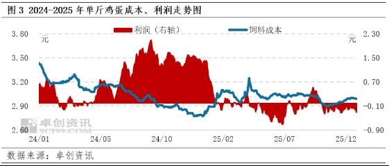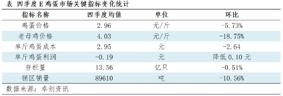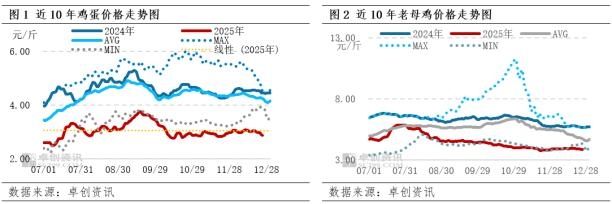 | 【导语】四季度蛋鸡市场供应虽有降低,但支撑动力不足,而需求在中秋节、国庆节结束后,整体处于疲软状态,供需压力环比增加,鸡蛋、老母鸡价格重心进一步下移,行业整体步入亏损区间。2026年一季度在供应压力降低,需求先增后降的预期下,产能与价格处再平衡阶段,预计主产品价格或先涨后降。 四季度供需失衡,蛋鸡行业步入深度调整期 根据卓创数据监测,四季度鸡蛋均价2.96元/斤,较三季度价格下跌5.73%;老母鸡均价跌至4.03元/斤,环比下滑18.75%。尽管季度内饲料等成本回落,单斤鸡蛋成本降至2.95元,环比降幅2.64%,但蛋价跌幅更深,导致养殖利润进一步恶化,单斤鸡蛋毛利润季度平均为-0.19元,较三季度亏损扩大0.10元。