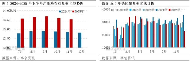 殖盈利状况虽不直接决定短期蛋价波动,但通过影响养殖户的补栏与淘汰决策,间接调节中长期产能,进而影响价格水平。持续亏损导致四季度养殖单位补栏意愿明显减弱,出栏积极性提升,产能扩张势头受到抑制,并逐步进入“去产能”阶段。 基本面变化:供应量环比减少,而需求疲软成行情最大利空因素 产蛋鸡存栏量在四季度出现降低拐点。11月产蛋鸡存栏量约13.52亿只,环比下降0.49%,同比减少5.32%,季度均值环比降低0.51%。尽管存栏量开始回落,但绝对数量依然处于历史较高水平,且存栏结构中的中大码鸡蛋占比偏高,大码鸡蛋供应压力较大,持续对蛋价形成压制。