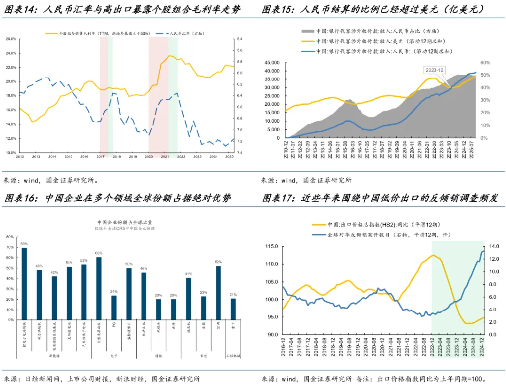而在市场高度关注的人民币升值对出口出海链的影响上,从历史上看人民币趋势性升值期间,高海外暴露(海外业务收入占比超50%)个股组合的销售毛利率往往会经历先升后降的过程,整体幅度并不算大,且与2016年至2017年、2020年至2021年两轮升值周期相比,当下在出口结构、结算方式、贸易环境上都存在明显的不同,投资者可能无需过于高估人民币升值对出口出海企业竞争力的削弱幅度。一方面,随着人民币认可度的不断提升,当前出口的结算货币中,人民币结算的比例已经超过美元;另一方面,当前大量出口高景气的领域,中国集中了全球主要的产能与份额,具备一定的不可替代性,且产品附加值更高,价格传导能力更强;值得一提的是,近些年来围绕中国低价出口的贸易制裁事件频发,中国出口价格的适当回升可以部分缓和对华贸易保护主义的激烈反弹。