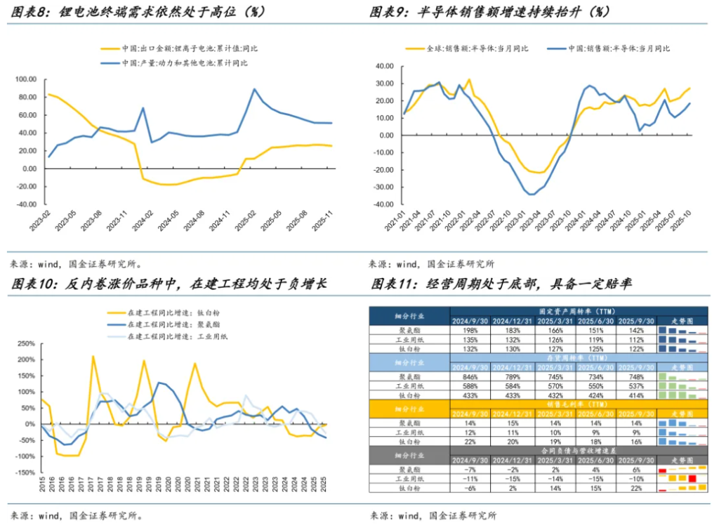 而对于反内卷相关部分行业而言,需求侧具备一定支撑,政策执行意愿相对较强的环节价格传导可能较为顺利,其上涨也更具持续性,如锂电产业链、晶圆制造等。而相较之下,对于下游需求本身相对疲弱的行业而言(如钛白粉),在下游承受力可能有限的约束下,其价格的上涨持续性还需观察,然而好消息是其行业本身新增产能已然有限,当需求边际修复之际或涨价顺利传导,其板块困境反转的概率同样较高。