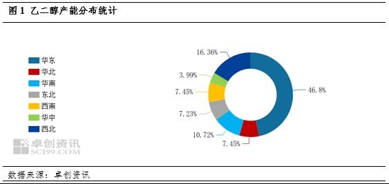 | [导语] 2025年12月乙二醇装置检修略有增加,且下游聚酯开工仍维持高位,乙二醇库存增加幅度相对较小,但后续春节假期前后仍有较高的累库预期。 本月乙二醇产能基数在3154.2万吨。山东裕龙石化一期80万吨/年乙二醇装置2025年9月试车成功,2025年10月9日计入产能基数,中国乙二醇行业产能提升至3154.2万吨。从区域占比来看,华东地区仍为最主要生产地区,在山东裕龙石化投产后,华东地区乙二醇产能占比占比提升至46.79%。宁夏畅亿20万吨/年装置2025年11月试车,2025年12月上旬出料,目前暂未计入产能基数。