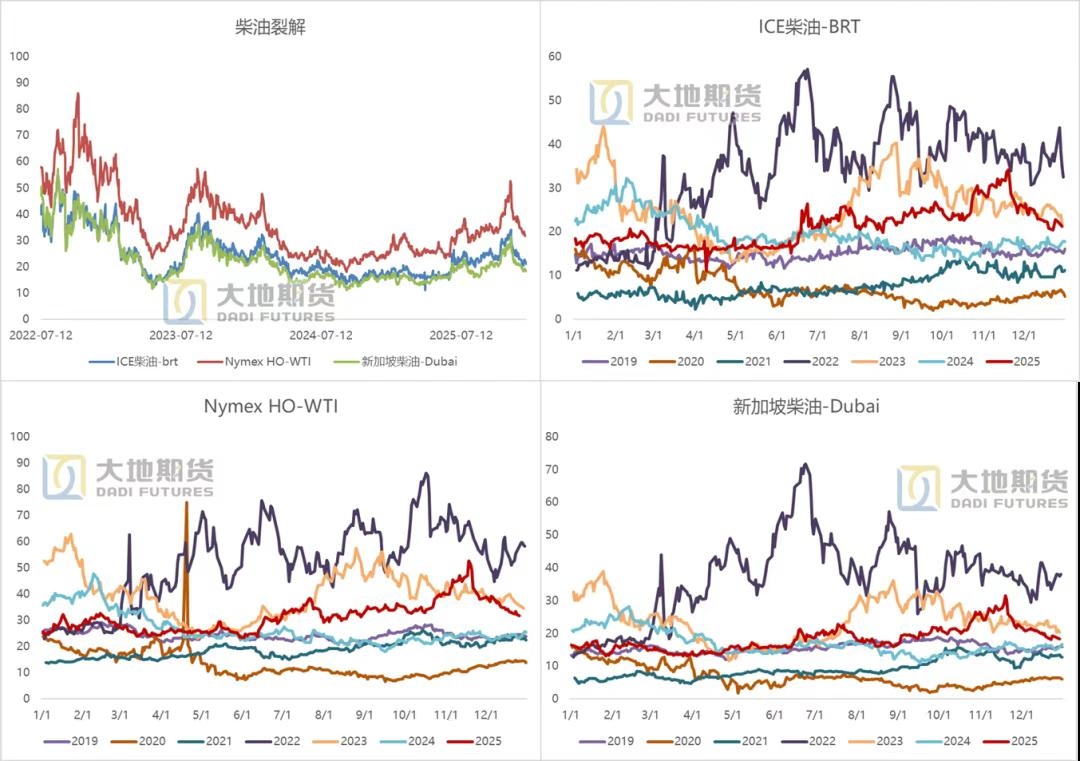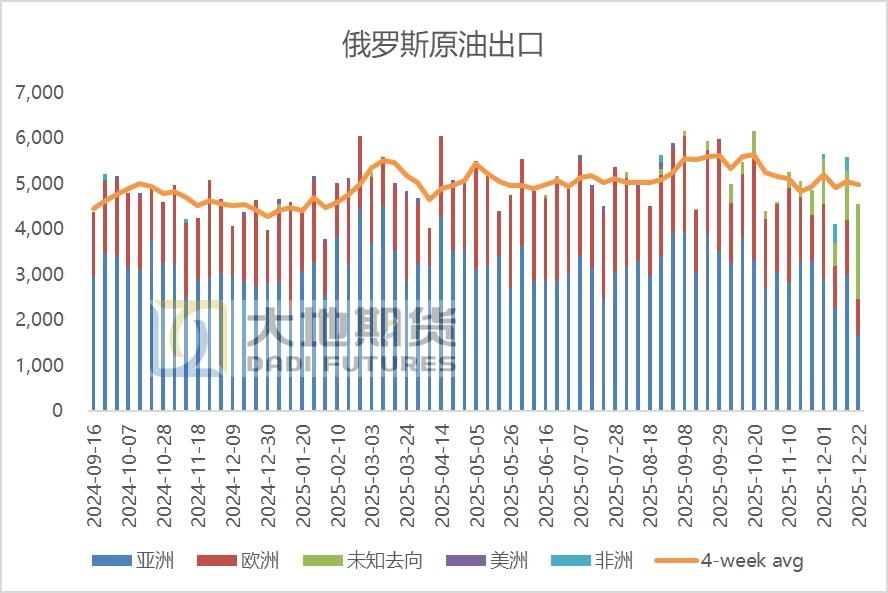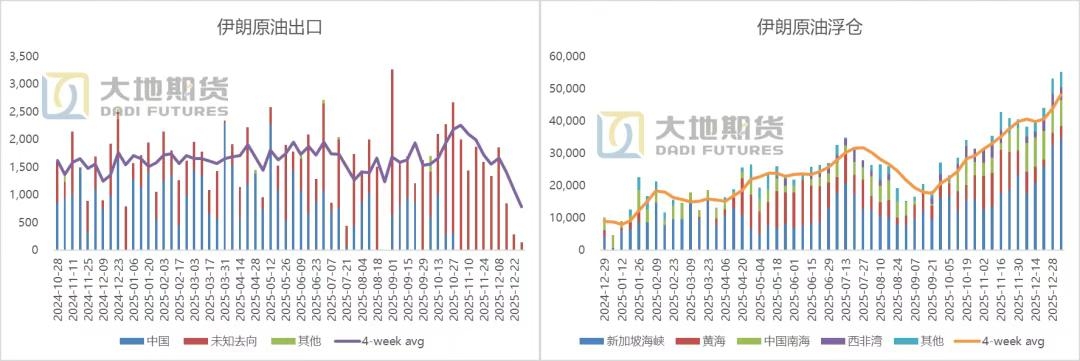 数据来源:大地期货研究院 水上向岸罐转移还在继续 水上库存来看,浮仓的继续累积反映了制裁的持续影响;在途的周度回落反映了进入12月后OPEC增产放缓,整体发运压力减弱。