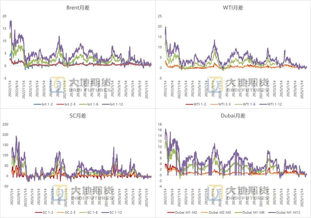 数据来源:大地期货研究院 03、结构数据更新 月差维持back,brt强于wti 截至12月26日,ti近次月价差收于0.19,近2-3收于0.13;brt近次月收于0.43,近2-3收于0.3;SC近次月收于-5.4。