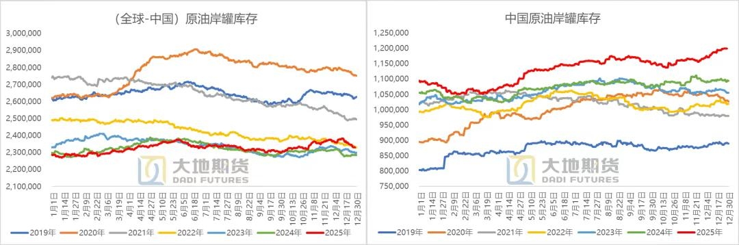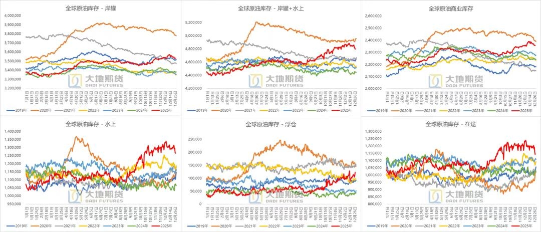 数据来源:大地期货研究院 02、水上向岸罐转化 地区库存情况仍分化 全球除中国外库存近两周出现回落,降幅达到4900万桶,去库速度达到350万桶日;中国持续吸收水上库存,12月以来库存增加3500万桶,累库速率为120万桶日。