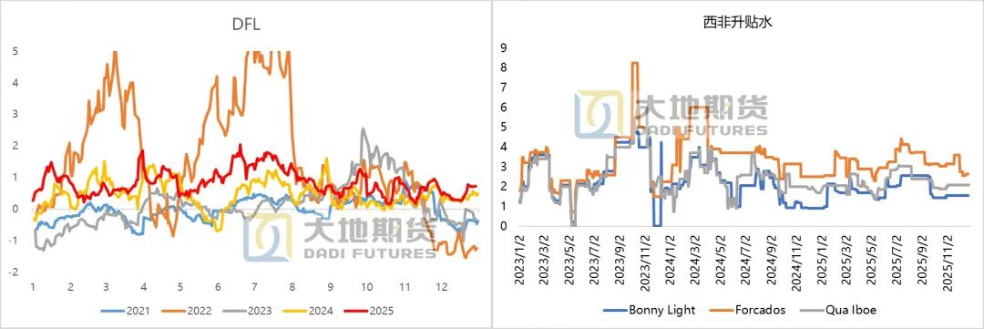 数据来源:大地期货研究院 一方面,制裁影响下现货有支撑 北海、西非等地现货升贴水均处于中性偏高水平。