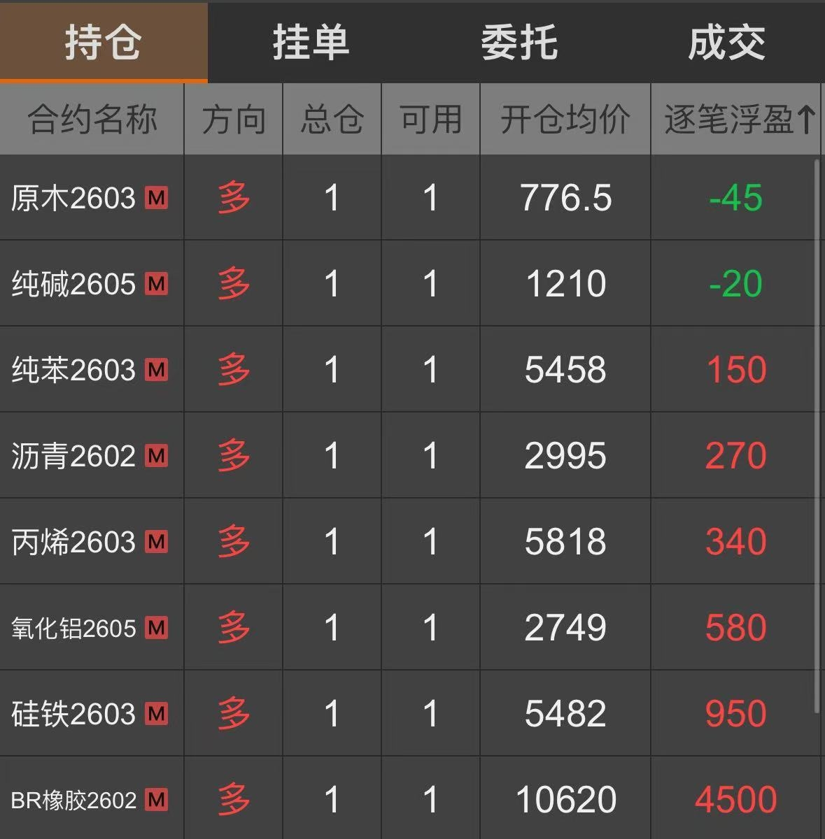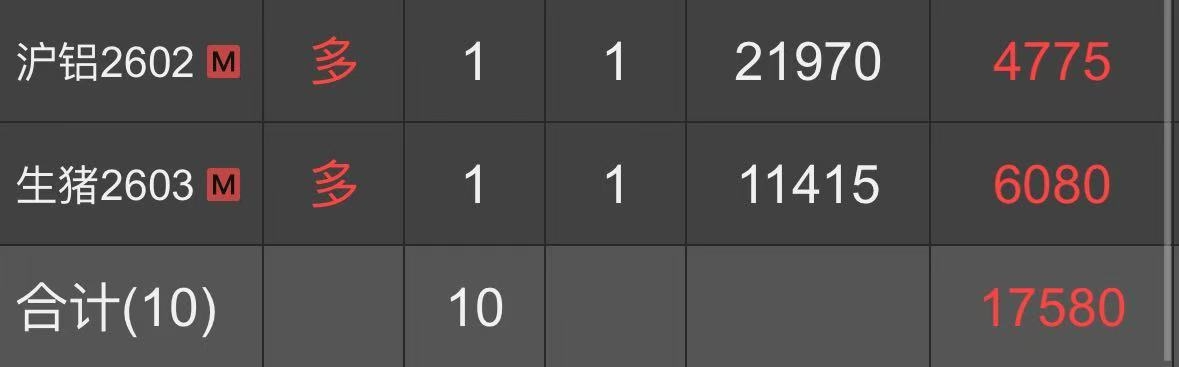 | 一、开仓总结 沪铝:2025年12月9日,达到启动点的开仓条件,所以在14:57开多一手沪铝2601合约,开仓价为21775。沪铝2601合约于2025年12月10日21:05移仓至主力合约2602,开仓价为21970。 BR橡胶:2025年12月10日,达到启动点的开仓条件,所以在14:49开多一手BR橡胶2602合约,开仓价为10620。 硅铁:2025年12月16日,达到启动点的开仓条件,所以在14:53开多一手硅铁2603合约,开仓价为5482。 生猪:2025年12月17日,达到启动点的开仓条件,所以在09:00开多一手生猪2603合约,开仓价为11415。 沥青:2025年12月17日,达到启动点的开仓条件,所以在14:52开多一手沥青2602合约,开仓价为2995。 纯苯:2025年12月24日,达到启动点的开仓条件,所以在14:54开多一手纯苯2603合约,开仓价为5458。 原木:2025年12月26日,达到启动点的开仓条件,所以在14:39开多一手原木2603合约,开仓价为776.5。 氧化铝:2025年12月30日,达到启动点的开仓条件,所以在14:47开多一手氧化铝2605合约,开仓价为2749。 丙烯:2025年12月30日,达到启动点的开仓条件,所以在14:49开多一手丙烯2603合约,开仓价为5818。 纯碱:2025年12月30日,达到启动点的开仓条件,所以在14:50开多一手纯碱2605合约,开仓价为1210。 二、平仓计划 沪铝:达到启动点的平仓止损/止盈条件,在收盘前或下一个交易日开盘后全部平仓。 BR橡胶:达到启动点的平仓止损/止盈条件,在收盘前或下一个交易日开盘后全部平仓。 硅铁:达到启动点的平仓止损/止盈条件,在收盘前或下一个交易日开盘后全部平仓。 生猪:达到启动点的平仓止损/止盈条件,在收盘前或下一个交易日开盘后全部平仓。 沥青:达到启动点的平仓止损/止盈条件,在收盘前或下一个交易日开盘后全部平仓。 纯苯:达到启动点的平仓止损/止盈条件,在收盘前或下一个交易日开盘后全部平仓。 原木:达到启动点的平仓止损/止盈条件,在收盘前或下一个交易日开盘后全部平仓。 氧化铝:达到启动点的平仓止损/止盈条件,在收盘前或下一个交易日开盘后全部平仓。 丙烯:达到启动点的平仓止损/止盈条件,在收盘前或下一个交易日开盘后全部平仓。 纯碱:达到启动点的平仓止损/止盈条件,在收盘前或下一个交易日开盘后全部平仓。 注:本交易总结由第三方提供,只作为投资理念和方法的交流,不作为七禾网的观点,也不作为投资参考和建议。 附: 1、交易者简介 十年股票/期货/外盘交易经验,每年都实现投资盈利。 擅长微观盘面分析和宏观市场分析,总结了数套有效的盈利模式,和众多高手有深入交流,收益良好。 2、持仓截图