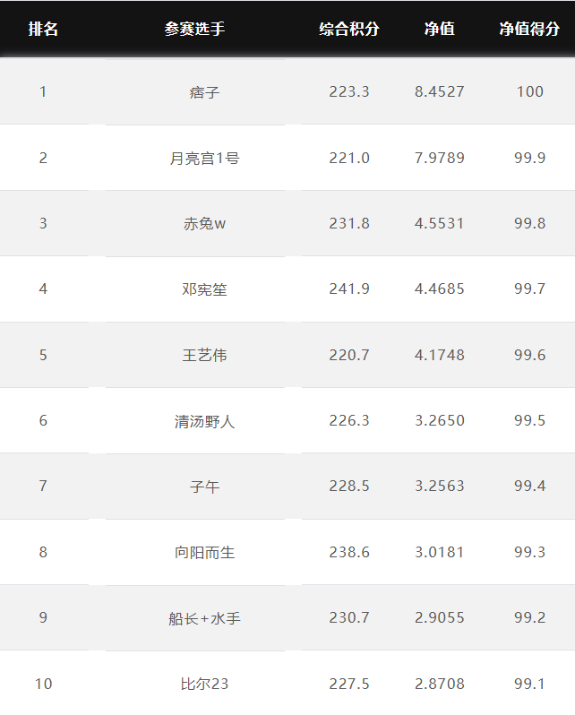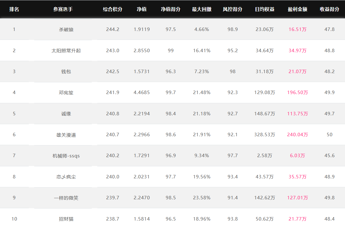 奖金上不封顶 特定期货公司参赛奖金翻倍 优秀选投 每周选优秀选手对接资金 达标必投 单笔最多给1个亿管理型资金 管理型资金盈利分成20%~70% 免费培训/研报/调研/咨询 诚邀您参赛! 为了促进国内期货市场交易人才的发展和成熟,七禾网举办本次“期货CTA英雄联盟”实盘大赛&超级服务,招募优秀的操盘手,为优秀的交易人才搭建桥梁! 第四届大赛圆满结束,第五届荣耀开启,欢迎参赛!第五届大赛已于2025年7月1日开赛,火热报名中,比赛过程中持续接受报名,大赛奖金&管理型资金&超级服务,等你来领! 2023年2月16日后,在主办方指定的几家期货公司中的某一家C公司新开户参赛,享奖金翻倍! 在主办方指定的几家期货公司中的某一家B公司新开户参赛,享奖金翻倍! 大赛中的优秀选手,只要在大赛中有3个月及以上的实盘业绩,主办方将每周发送优秀参赛者的业绩、资料给合作的数十家资方,供其考察是否投管理型资金。至2022年8月12日,资方已选出23名优秀投顾,累计投入超5.5亿元管理型资金。 优秀选投:通过主办方及资方考核后,将获得管理型资金(资金来源:七禾网自有资金(买优秀选手的基金产品)、七禾网股东、数十家合作资方) 在主办方指定的几家期货公司中的某一家B公司新开户参赛,以及2023年2月16日后,在主办方指定的几家期货公司中的某一家C公司新开户参赛,可以按照:“达标必投”进行考核(将给予单笔100万元~1亿元的管理型资金,分红比例20%~70%),详细规则请联系微信:15858201632 大赛综合排名前10名 2025.12.31
