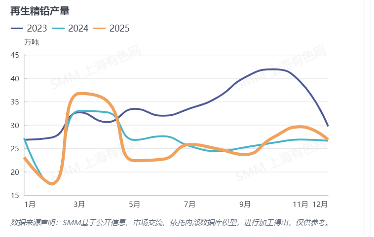 | 报告品种:铅 原文链接:https://mp.weixin.qq.com/s/zWOgQdIPfg_TPbouwAZZQg 2025年12月再生铅产量下滑,环比减少5.03%,同比去年增加10.3%;再生精铅产量环比下降9.33%,同比去年增加0.84%。