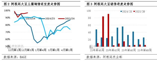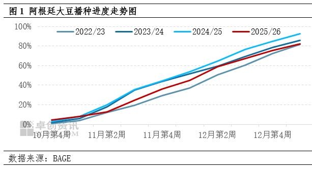 | 【导语】近期市场对于后期阿根廷天气预报转干的关注度上升,但从当地交易所发布的数据看,土壤湿度充足,预计干旱对于大豆产量预估的影响较为有限。国内豆粕市场目前供应宽松,下游采购情绪谨慎,卓创资讯预计1月上旬豆粕价格震荡下行,全国均价跌至3000元/吨。 阿根廷大豆播种接近尾声 产量预估维持不变 根据阿根廷布宜诺斯艾利斯交易所的数据显示,截止2025年12月30日,阿根廷大豆播种进度为82%,环比增加6.5%。前期充足的降水,加速了产区北部的播种进度,目前已播种大豆的区域中,96.1%的作物生长状况为优秀和正常,同时97%的地块土壤水分为极佳和适宜。与此同时,17.3%的第一茬优质大豆已进入生殖生长阶段,第二茬普通大豆的播种作业已完成计划面积的71.9%,出苗率整体良好,仅部分积水的地块需要进行补种。从今年的整体播种走势看,虽然整体落后于去年同期,但从环比看中后期的播种速度仍旧较快,因此价格对于数据的同比滞后反馈清淡。