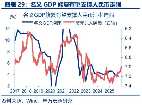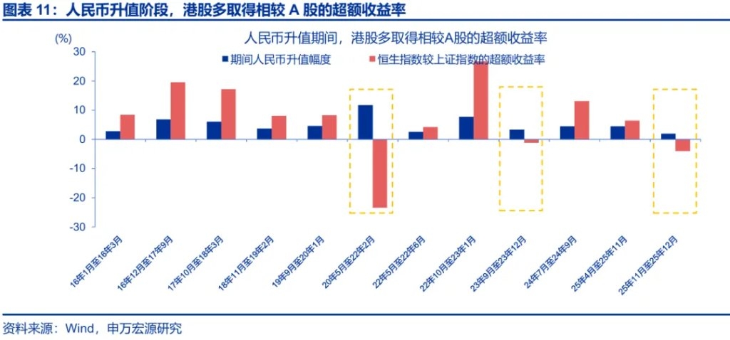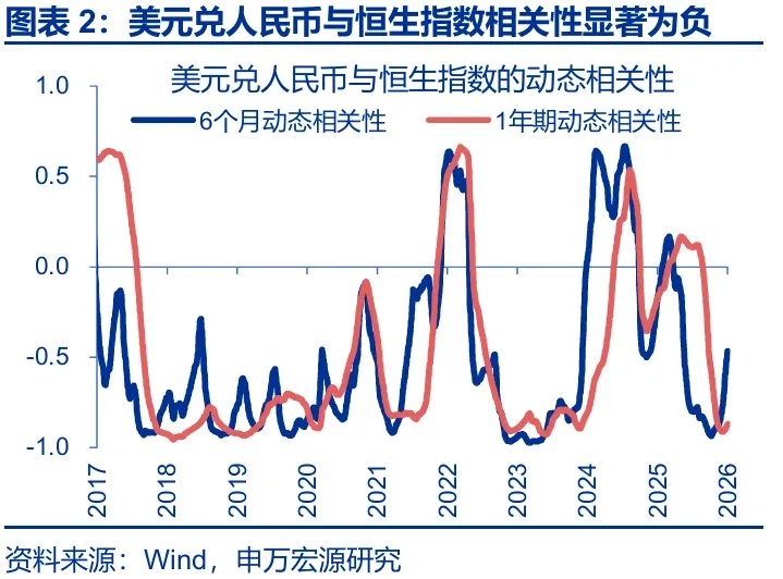 向后看,随着汇率与港股关系的逐步修复,2026年,人民币升值有望再度成为港股上涨的助力之一。短期来看,年底获利了结交易结束后,港股年初的一月效应往往较为强劲。展望全年,随着“待结汇”逻辑的演绎、名义GDP的修复、中美贸易摩擦的边际降温,人民币的韧性有望延续。伴随着汇率升值“重估效应”、“配置效应”的逐步修复,如果人民币汇率与港股重回正相关关系,人民币升值有望成为宏观层面港股上涨的又一助力。 [6]更多分析可参考报告《人民币升值,“结汇潮”的助推?》。