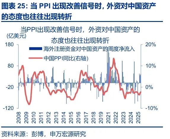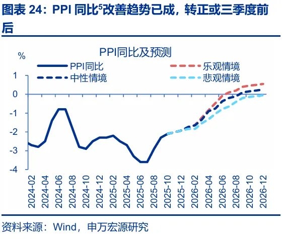 另一方面,人民币汇率升值对港股的“配置效应”也有望恢复:PPI的回升有望继续吸引外资流入,居民存款再配置效应对港股也有溢出效应。1)在“反内卷”政策加码下,供给收缩的预期升温提振大宗商品价格,另一方面产能利用率的拖累在产能出清的影响下在明年亦有望逐步缓解,中国PPI在明年有望维持当前的改善态势。历史回溯来看,当PPI出现改善信号时,外资对中国资产的态度也往往出现明显转折。2)本轮潜在牛市,居民存款再配置有很大空间;多数情况下,内地投资者往往在A股赚钱效应明显扩散后,将战场转移至港股。 [5]中性情境下,2026年国际油价中枢或为65美元/桶,铜价保持高位,国内钢价低位震荡,国内煤价或有所上行;中下游方面,虽然民企占比较高、反内卷政策推进速率或偏慢,但也有望更稳健的推动中下游价格逐步走出通缩;预计PPI同比在明年9月转正。乐观情境下,若国际油价中枢为75美元/桶,国内反内卷进度推进较快,PPI同比转正时点或在明年7月。悲观情景下,国际油价中枢回落至55美元/桶,国内反内卷推进进度较慢,PPI同比转正时点或在2027年初。