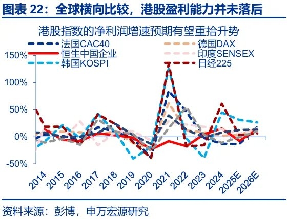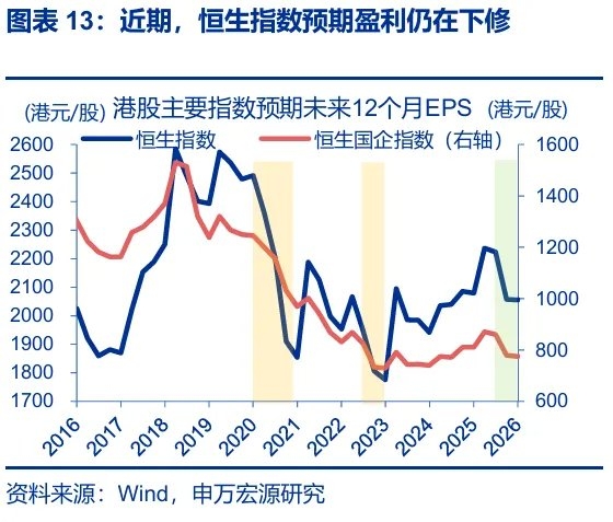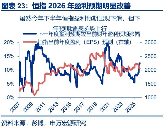 (三)未来港股与人民币关系可能的演绎?联动或将回归,港股有望与人民币共振 一方面,业绩表现是决定港股能否受益汇率升值“重估效应”的关键;申万策略此前发布的《从彼岸,到此岸——2026年港股和海外中资股投资策略》中提到,2026年港股盈利有望出现边际改善。 1)表面上,2025年港股指数层面的盈利预期在中报后明显下行,但其背后主要由部分大型平台类企业拖累,且这一趋势在中报之后并未出现线性下滑。2)若以盈利预期修正宽度来看,以我们追踪的五百余家港股公司样本股来统计,当前财年盈利预期上修公司占比自今年年初以来处于明显的上行趋势中,越来越多的公司盈利出现了改善的迹象。3)历史回溯来看,“下一财年盈利同比增速向上+当前财年盈利预期向下”这一组合往往是盈利预期改善的前瞻信号 。叠加2026年相关权重板块的盈利有望在低基数效应下明显修复,盈利有望成为2026年港股市场上行的重要驱动力。 [4]背后的逻辑是,往往在新技术新应用推广前夕,相关行业需要加大Capex支出从而压低当年盈利预期,但未来的盈利预期有望受到新技术的提振而上行,因此观察市场当前财年和下一财年盈利预期的增速缺口有助于判断投资者对盈利趋势的看法。