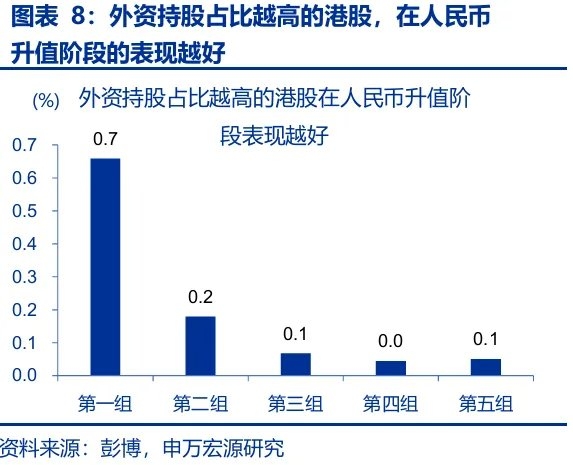 人民币升值时,港股盈利、资产的重估效应与外资的回流,或是港股上涨的主因。1)货币价值重估效应,内地公司是港股重要构成,这类公司盈利由人民币计价,当人民币升值时,公司赚取的人民币利润折算港币时数值会放大。2)资产重估效应,许多在港上市的地产股等,其底层资产以人民币计价,在升值时会面临价值重估。因而,账面价值越大的上市港股公司(PB越低),在汇率升值时表现越突出。3)全球配置的比较效应,人民币汇率走强多指向中国基本面具有一定相对优势,这会令全球投资者配置更多中国资产。 因此,外资青睐的个股在升值时通常表现更突出。 [1]为验证这一逻辑,我们将所有港股按照中国内地收入占比由高到低划分为4组,海外占比高的第四组中,仅27.0%的公司股价与人民币显著正相关,而内地收入占比高的第一组则高达32.0%。 [2]由于全球投资者是出于基本面相对强弱的逻辑来进行全球资产配置,但常用的宏观指标更多用来进行纵向比较,横向间相对强弱的指标数量并不多,汇率是其中较为常用的指标之一。