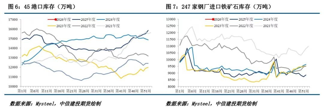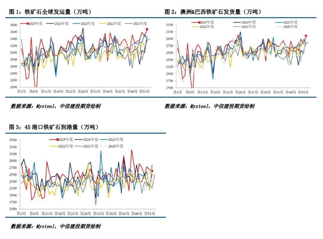 二、铁矿石供给:季度末冲量结束,供给进入扰动频发期 海外矿山季度末冲量结束,且进入到季节性发运淡季,不能排除极端天气扰动的可能,故供给方面有一定支撑。 发运方面,本期全球铁矿发运总量下降,澳巴发运总量下降。2025年12月29日-2026年1月4日Mysteel全球铁矿石发运总量3213.7万吨,环比减少463.4万吨。澳洲巴西铁矿发运总量2742.7万吨,环比减少316.9万吨。澳洲发运量1939.6万吨,环比减少174.1万吨,其中澳洲发往中国的量1615.3万吨,环比减少252.3万吨。巴西发运量803.2万吨,环比减少142.7万吨。 到港方面,本期到港总量增长,铁矿石近端供增长。2025年12月29日-2026年01月04日中国47港到港总量2824.7万吨,环比增加96.9万吨;中国45港到港总量2756.4万吨,环比增加155.0万吨;北方六港到港总量1512.9万吨,环比增加182.3万吨。 国内方面,本期供给下降,库存下降。截至12月31日,Mysteel统计全国186家矿山企业日均精粉产量43.33万吨,环比降0.06万吨,同比降2.94万吨。矿山精粉库存84.52万吨,环比降0.95万吨。