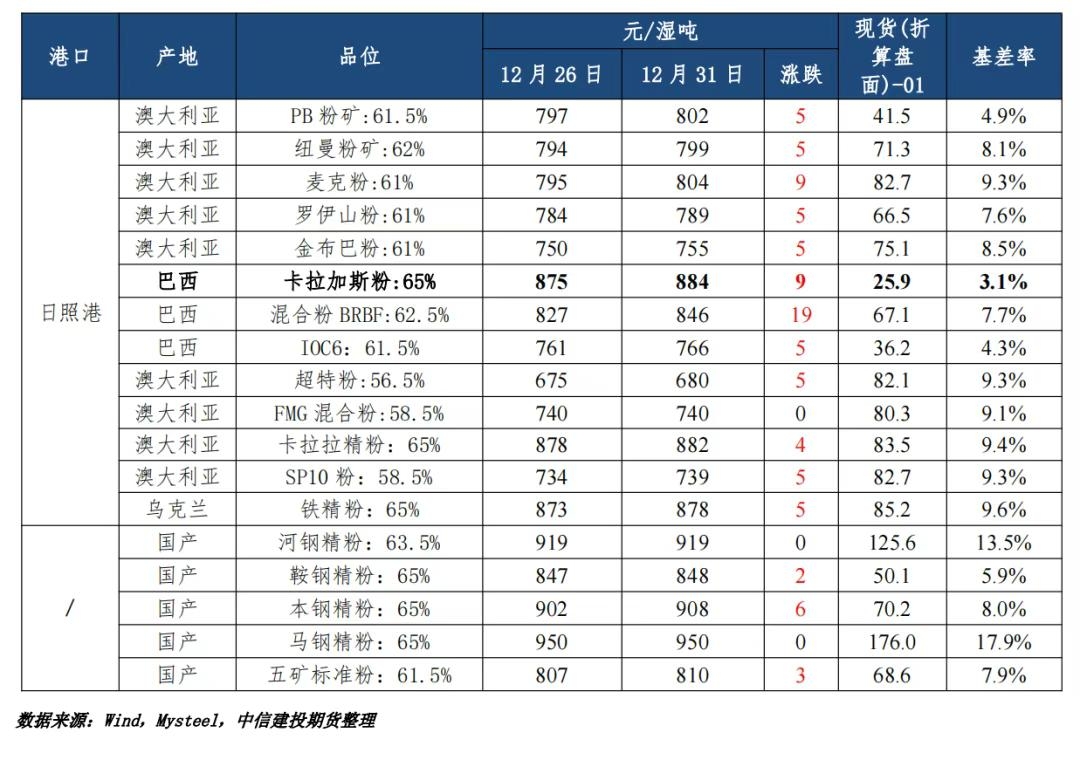 | 一、铁矿石价格:整体偏强 近期铁矿现货偏强运行。周度来看,外矿普遍涨4-19元/吨,内矿涨2-6元/吨。另外,当前最优交割品为卡粉,01合约基差约25.9元/吨,01合约基差率约3.1%,近期现货走强,基差率扩大,也对期货盘面形成一定支撑。