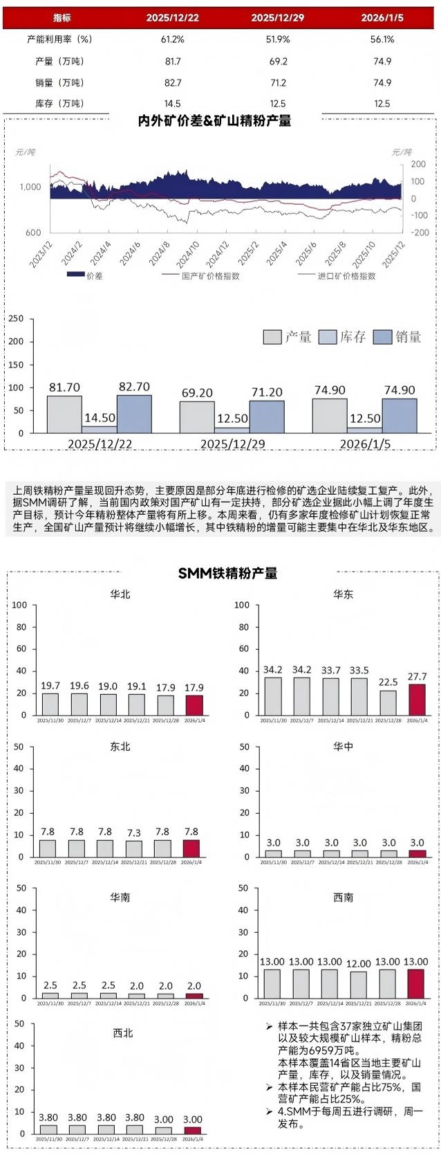 | 报告品种:铁矿石 原文链接:https://mp.weixin.qq.com/s/oTs-cpv1OigbcG7iPY0h1w 根据SMM最新统计数据,上周国内矿山整体产能利用率约达56.1%,较前一周显著提升4.2个百分点。同期,铁精粉产量达到74.9万吨,环比增加5.7万吨;矿山铁精粉库存保持稳定,维持在12.5万吨水平。 上周铁精粉产量呈现回升态势,主要原因是部分年底进行检修的矿选企业陆续复工复产。此外,据SMM调研了解,当前国内政策对国产矿山有一定扶持,部分矿选企业据此小幅上调了年度生产目标,预计今年精粉整体产量将有所上移。本周来看,仍有多家年度检修矿山计划恢复正常生产,全国矿山产量预计将继续小幅增长,其中铁精粉的增量可能主要集中在华北及华东地区。