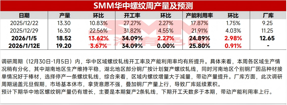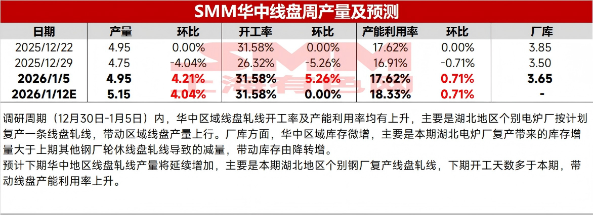 | 报告品种:螺纹钢 原文链接:https://mp.weixin.qq.com/s/n8pNYwylpxL30GiUOFVj7A 调研周期(12月30日-1月5日)内,华中区域钢厂螺纹、线盘轧线的开工率及产能利用率均小幅上升。