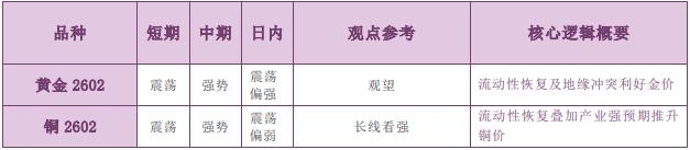 说明: 1.有夜盘的品种以夜盘收盘价为起始价格,无夜盘的品种以昨日收盘价为起始价格,当日日盘收盘价为终点价格,计算涨跌幅度。 2.跌幅大于 1%为弱势,跌幅 0~1%为震荡偏弱,涨幅 0~1%为震荡偏强,涨幅大于 1%为强势。 3.震荡偏强/偏弱只针对日内观点,短期和中期不做区分。 主要品种价格行情驱动逻辑—商品期货 品种:黄金(AU) 日内观点:震荡偏强 中期观点:强势 参考观点:观望 核心逻辑:昨日金价震荡上行,夜盘维持强势运行,纽约金站上 4500 美元关口,沪金逼近 1010 元关口。1 月 3 日,美军对委内瑞拉进行空袭,并抓获委内瑞拉总统。这使市场的避险情绪升温,导致金价高开。但随后日内从大类资产走势来看,市场的恐慌情绪并未蔓延,美股道指再创新高,节后市场风险偏好和流动性依旧较高。我们认为这是推升金价的一大原因。短期金价重返 12 月下旬高位,关注该位置技术压力。 品种:铜(CU) 日内观点:震荡偏弱 中期观点:强势 参考观点:长线看强 核心逻辑:昨日沪铜持续增仓上行,表现强势,日内站上 10.5 万关口,伦铜站上 1.33 万美元关口。亚洲盘后,伦铜一度抹去日内 200 美元以上的涨幅,而国内夜盘前铜价再度回升,短期内外资金分期较大。12 月以来铜价上涨的核心驱动是宏观流动性宽松与矿端扰动,以及长期的 AI 叙事。宏观与金融因素:为铜价上涨提供“燃料”12 月以来,美国和日本央行货币政策相继落地,短期靴子落地,市场风险偏好回升,流动性也随之恢复,全球大类资产普涨。此外,市场普遍预期美联储 2026 年将继续降息,全球流动性转向宽松。这直接降低了持有金属的机会成本,并增强了铜的金融属性,吸引资金流入。供应端(矿端)约束:构筑坚实“地板”,矿端的紧张是贯穿始终的核心叙事。铜陵有色在 2026 年 1 月 4 日正式发布公告,确认其位于厄瓜多尔的米拉多铜矿二期工程投产延期。核心原因:厄瓜多尔政局波动、主管部门人事频繁变动,导致关键的 《采矿合同》迟迟无法签署。该项目预计年产铜金属量约 20 万吨。它的延期意味着全球铜矿新增供应不及预期。短期资金关注度较高,上行动能较强,但也要注意风险,控制仓位,谨防资金获利了结导致高位回落。 责任编辑:七禾小编 |