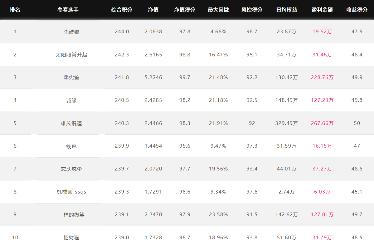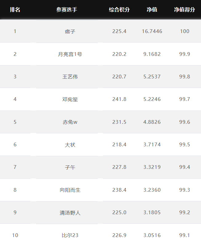 大赛净值排名前10名 2025.1.6