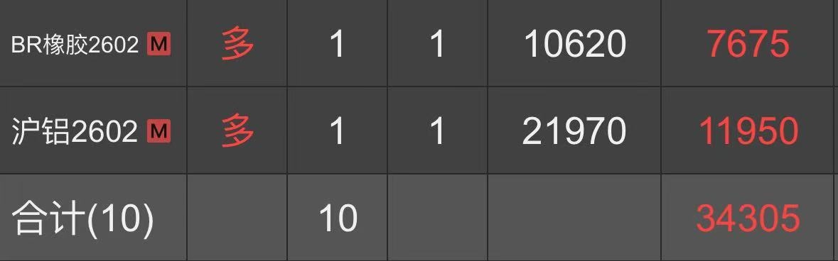 | 一、开仓总结 沪铝:2025年12月9日,达到启动点的开仓条件,所以在14:57开多一手沪铝2601合约,开仓价为21775。沪铝2601合约于2025年12月10日21:05移仓至主力合约2602,开仓价为21970。 BR橡胶:2025年12月10日,达到启动点的开仓条件,所以在14:49开多一手BR橡胶2602合约,开仓价为10620。 硅铁:2025年12月16日,达到启动点的开仓条件,所以在14:53开多一手硅铁2603合约,开仓价为5482。 生猪:2025年12月17日,达到启动点的开仓条件,所以在09:00开多一手生猪2603合约,开仓价为11415。 沥青:2025年12月17日,达到启动点的开仓条件,所以在14:52开多一手沥青2602合约,开仓价为2995。沥青2602合约于2026年1月6日21:17移仓至主力合约2603,开仓价为3159。