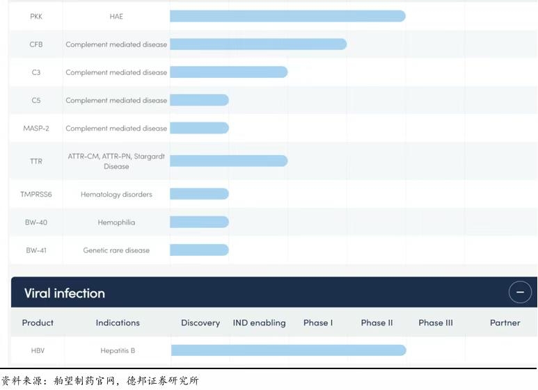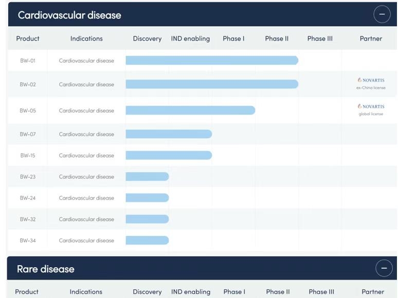 瑞博生物已有2笔BD,市场认可度高。1)2023年12月,瑞博生物与齐鲁制药达成协议,将抗PCSK9小核酸新药RBD7022在大中华区的开发、生产和商业化的独家权利授权给齐鲁制药,从而获得总价值超过7亿元的首付款以及里程碑付款。2)2024年1月3日瑞博生物与德国勃林格殷格翰就共同开发治疗非酒精性或代谢功能障碍相关脂肪性肝炎(NASH/MASH)的小核酸创新疗法达成合作;瑞博将有权获得基于开展临床研究、药物注册和商业成功等里程碑付款以及上市产品的阶梯式销售提成,潜在总交易金额超过20亿美元。 5.2.舶望制药:多款小核酸药物进入临床,与诺华合作大金额BD 舶望制药成立于2021年4月,是一家专注于siRNA药物开发的生物科技公司,核心成员来自于siRNA药物公司Arrowhead以及默沙东等跨国药企。目前公司已有多个管线进入临床,其中BW01、BW02进入临床II期,临床前管线也很丰富,适应症领域涵盖心血管疾病、罕见病、乙肝、自身免疫、神经系统疾病等。