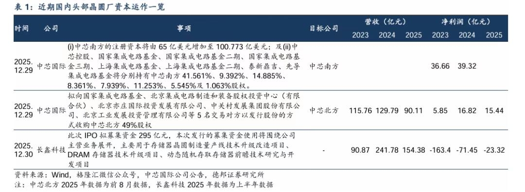 我们认为,央视公布的解放军无人机航拍台北101大厦图片,是此次演习中极具震撼力的战略威慑信号,直观印证了解放军对台岛全域的掌控能力。这一画面不仅展现了我国无人机技术的领先性,更以可视化方式打破了“台独”势力臆想的“战略纵深”,传递出“台岛全域皆在掌控范围”的明确信号。台北101作为台湾地标性建筑,其清晰出现在解放军无人机镜头中,既检验了无人机突防、高空侦察的实战效能,也向外界释放出“任何分裂行径都无法阻挡祖国统一进程”的强烈信号,进一步夯实了维护台海和平稳定的军事基础。 值得注意的是,此次“正义使命-2025”演习的战略价值,在当前复杂地缘政治背景下更显突出。此前日本首相高市早苗公然发表涉台严重错误言论,将“台湾有事”与日本“存亡危机事态”挂钩,加剧了台海周边局势的不稳定性。在此背景下,我们认为,军工产业链作为捍卫国家主权、应对外部风险的核心支撑,其战略价值愈发凸显。而“十五五”发展期间,恰逢实现建军一百年奋斗目标的关键攻坚期,如期建成世界一流军队的战略要求将持续牵引军工产业在技术创新、产能升级、体系化发展上实现突破,形成“强军需求牵引产业升级、产业发展支撑强军目标”的良性循环,为维护国家主权安全和发展利益筑牢物质技术根基。 4、硬科技:头部晶圆厂密集进行资本运作,产业发展进入 新阶段 国内头部晶圆厂密集进行资本运作。1)2025年12月29日,中芯控股与国家集成电路基金、国家集成电路基金二期、国家集成电路基金三期、上海集成电路基金、上海集成电路基金二期、泰新鼎吉及先导集成电路基金订立新合资合同及新增资扩股协议,将中芯南方的注册资本将由65亿美元增加至100.773亿美元;2)2025年12月29日,中芯国际公告拟通过发行股份购买资产的方式,向国家集成电路基金、集成电路投资中心、亦庄国投、中关村发展、北京工投发行股份购买其所持有的中芯北方49.00%股权,交易对价为406.01亿元。本次交易完成后,中芯国际将持有中芯北方100.00%的股权,中芯北方成为全资子公司;3)长鑫科技集团股份有限公司于12月30日公开了科创板招股书,此次IPO拟募集资金295亿元,有望成为科创板创立以来募资规模第二大的IPO,仅次于2020年上市的中芯国际募资532.3亿元。