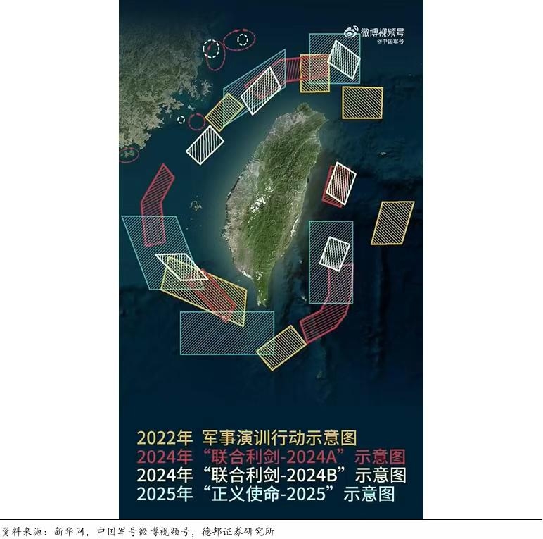 我们认为,与历次围台演习相比,此次演习区域呈现出“更精准、更贴近、更具针对性”的显著差异:此前“联合利剑-2024”系列演习虽覆盖台岛周边,但此次进一步将台岛南部细分为西南、东南两个区块,北部区块面积扩大且向北延伸,形成“三面围岛”的封控态势,既强化了对台岛关键港口、航线的管控,又针对性构建外线立体慑阻体系,阻断外部势力介入通道,围岛封控链条持续收紧,反分裂反干涉的战略指向愈发清晰。