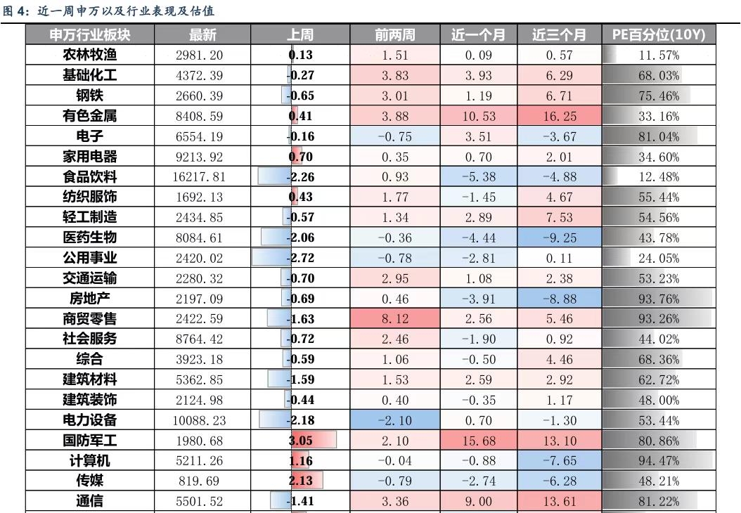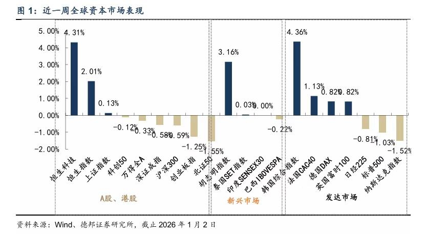| 1、市场复盘:2025年收官,春季行情轮廓渐清 上周(12/29-1/2)上证指数以3968收官2025年行情。全周上证指数上涨 0.13%,深证成指下跌0.58%,创业板指下跌1.25%,沪深300下跌0.59%。市 场日均成交额2.13万亿,较此前一周(12/22-12/26)交易量有所提升。 近期盘面表现上: A股方面:从风格看,近一周周期风格领涨,稳定、消费风格跌幅较深,31 个申万行业涨跌互现,其中公用事业、食品饮料、电力设备、医药生物、非银金融 领跌,最大跌幅2.72%;石油石化、国防军工、传媒、汽车、机械设备行业领涨, 最大涨幅3.92%。从换手率看,上周国防军工、电力设备、轻工制造、计算机、 商贸零售等板块交易热度较高。港股方面:港股市场26年首个交易日强势开局, 恒生指数全周收涨2.01%,恒生科技指数收涨4.31%。 海外市场方面:元旦期间海外地缘政治动荡加剧,美国总统特朗普宣布,美 军成功对委内瑞拉实施打击,抓获委总统马杜罗及其夫人,并带离委内瑞拉。上 周美股三大指数收跌:标普500指数下跌1.03%、纳斯达克综合指数下跌1.52%、 道琼斯工业指数下跌0.67%。欧洲市场方面,上周英国富时100上涨0.82%、德 国DAX上涨0.82%、法国CAC40上涨1.13%。新兴市场方面,胡志明指数上涨 3.16%、泰国SET指数上涨0.03%、巴西IBOVESPA指数下跌0.22%。 大宗商品方面:受美联储内部降息分歧加剧、美元走强等因素影响,国际金 价小幅波动。截止1月5日,COMEX黄金期货结算价4459.7美元/盎司,周度 上涨2.5%。海运数据方面,波罗的海干散货指数(BDI)近一个月跌幅32.1%。