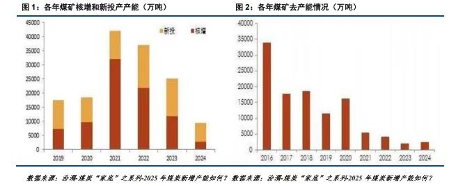 | 一、历年煤矿产能核增情况 根据国家矿山安监局公布的信息来看:2021年审核确认 207 处保供煤矿,核增煤炭产能3.1亿吨; 2022 年 前7个月,审核同意了 147 处先进产能煤矿,核增产能 1.8 亿。根据汾渭报告数据来看,2022年核增产能超2.1亿吨、2023年核增产能超1.1亿吨、2024年核增产能2670万吨。根据各方数据估算,“十四五”以来,煤矿总核增产能可能在6.5亿吨的量级。此外,粗略估算2021年至2024年新投产煤矿产能约4.5亿吨。与此同时,4年间煤矿去产能约1.5亿吨。总体而言,4年间煤炭总产能增加约9.5亿吨,历年新增产能逐渐下降,其中核增产能占比达到68%。这部分新增产能中以动力煤为主,炼焦煤为辅,具体比例数字难以统计。以上数据可能误差较大,仅供参考,后续估算数值也仅供参考。