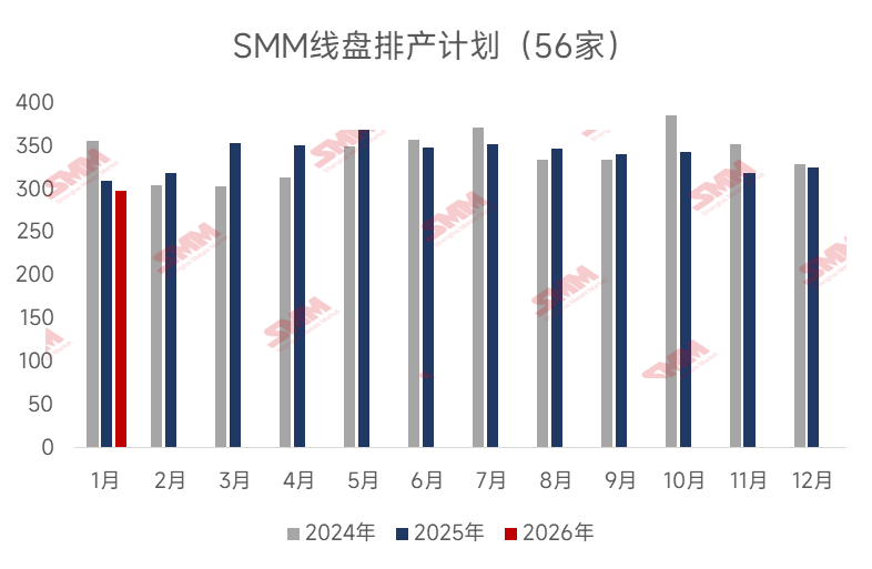 | 报告品种:螺纹钢 原文链接:https://mp.weixin.qq.com/s/0x4dxxJrbzdHRtc77mCIGw 据SMM调研重点生产钢企56个样本数据: 1月螺纹计划产量731.22万吨,较12月实际产量增加25.98万吨,增幅3.68%; 1月线盘计划产量298.2万吨,较12月实际产量减少26.73万吨,降幅8.23%。 图1-2:主流建材钢厂螺纹&线盘排产(56家)