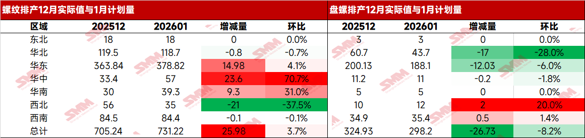 数据来源:SMM钢铁 整体来看 12月全国建筑钢材价格走势呈现区间震荡局面,中上旬国内政治局加经济会议利好均低于预期,且美联储降息未超预期,叠加出口许可证管制带来的恐慌情绪,现货价格跌至低位;中下旬悲观情绪消化后,双焦消息面带涨成材阶段性上涨,且临近元旦,资金在盘面上的操作减弱,现货交易回归基本面。成本方面,铁矿短期价格支撑力度较强,而焦炭四轮提降落地,原料端继续有让利,钢厂生产效益有好转,现阶段钢厂盈利率在69.44%,月环比继续改善,目前普遍效益水平在(-100-200)之间。1月各钢厂效益虽有好转,但季节性需求淡季,钢厂增产积极性不高,且部分钢厂仍有年检计划,建材总产量变化不大。具体来看,华东、中南区域钢厂均有棒线复产,产螺纹量有明显增加,但线盘前期产量较高,近期优先消化前期库存,1月线盘有减量。西北区域效益不佳,棒线有技改及检修计划,产量继续下降,而东北冬休阶段,部分钢厂继续外卖钢坯为主,建材产量保持低位。 分地区来看 表1:螺纹、盘螺排产上月实际值与本月计划量