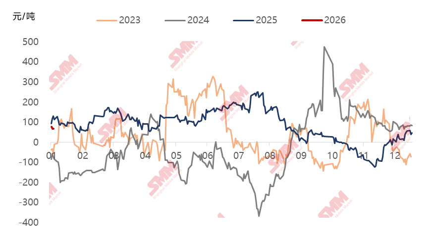 数据来源:SMM钢铁 东北地区,钢厂利润在(-100-0)之间,区域内钢厂生产效益变化不大,目前北材南下的优势不及钢厂直接出口长材,部分钢厂继续出口钢坯居多。 华北地区,钢厂利润在(-300-100)之间,螺纹产量本期变化不大,主要是线盘降幅明显。主要是区域内有部分山西钢厂1月开始高炉将轮休,且计划春节后复产,导致铁水不够,优先保卷带,其中个别厂家线盘轧线直接减半生产。 华东地区,钢厂利润在(0-300)之间,区域内厂家生产效益继续好于其他区域,但整体建材产量变化不大。江苏、福建、江西等地钢厂产建材均有一定增量,但山东区域有钢厂对1月建材行情走势持谨慎态度,恰逢年检期间,先将棒线进行检修,后期再根据利润情况调整至卷板。 西北地区,钢厂利润在(-300-0)之间,个别钢厂棒线进行技改,且1月有新增棒线检修,导致整体螺纹产量降幅明显;其次区域其他钢厂效益表现不佳,1月有高炉检修配套轧线停产。 华中、华南地区,钢厂利润在(-100-100)之间,近期整体效益有改善,前期检修钢厂1月陆续复产,轧线恢复正常生产,螺纹产量增幅明显,其中螺纹产量月环比增幅或在51.89%。 西南地区,钢厂利润在(-100-100)之间,效益虽有好转,但考虑年底需求表现不佳,区域钢厂基本维持前期生产水平。 图4:2023年至今钢厂生产螺纹钢即时利润走势
