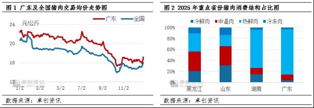 | 【导语】广东不仅是中国最大的猪肉消费市场之一,也是猪肉及其制品的主要进口地区之一,是南方最核心的猪肉主销区,也是全国价格最高区域。卓创资讯本次实地调研走访广东企业包含屠宰企业、加工厂、大型进口贸易商、冻品批发市场等;从鲜品到冻品全产品体系涵盖,广东猪肉消费体系以热鲜猪肉为主导,进口冻品补充,未来这一体系或将逐步优化,但短期内“热鲜为主、冻品补充”的格局仍将持续。 1.广东猪肉调入量多,且以热鲜消费为主 人口猪肉消费、屠宰资源、人口流动以及地理位置决定了广东地区的猪肉消费特点及价格水平,广东作为全国白条猪肉消费大省,且属于全国高价区域。从价格水平来看,2025年广东瘦肉型白条猪肉市场平均价格为19.75元/公斤,同比下滑15.81%,全国白条猪肉市场均价为17.70元/公斤,可以看出广东猪肉较全国均价高2.05元/公斤,在全国处于偏高水平,这也奠定了广东地区外调量偏少,且湖南、江西、广西等地生猪及猪肉调入频繁。本地属于高价区域,一方面来源于本地猪肉供应量少于消费量,另一方面则来源本地热鲜消费习惯,冷鲜调入少,且热鲜调入量受限。