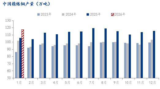 | 报告品种:铜 原文链接:https://mp.weixin.qq.com/s/mmNGuhMSkhgmOYQDUAWLrg?scene=1&click_id=23 Mysteel调研国内58家电解铜生产企业,涉及精炼产能1648万吨(含2025年新增产能)样本覆盖率98.93%得出: 2025年12月国内电解铜实际产量115.53万吨,环比增加1.3%,同比增加11.26%。1-12月国内电解铜产量累计为1356.15万吨,同比增加14.5%。
