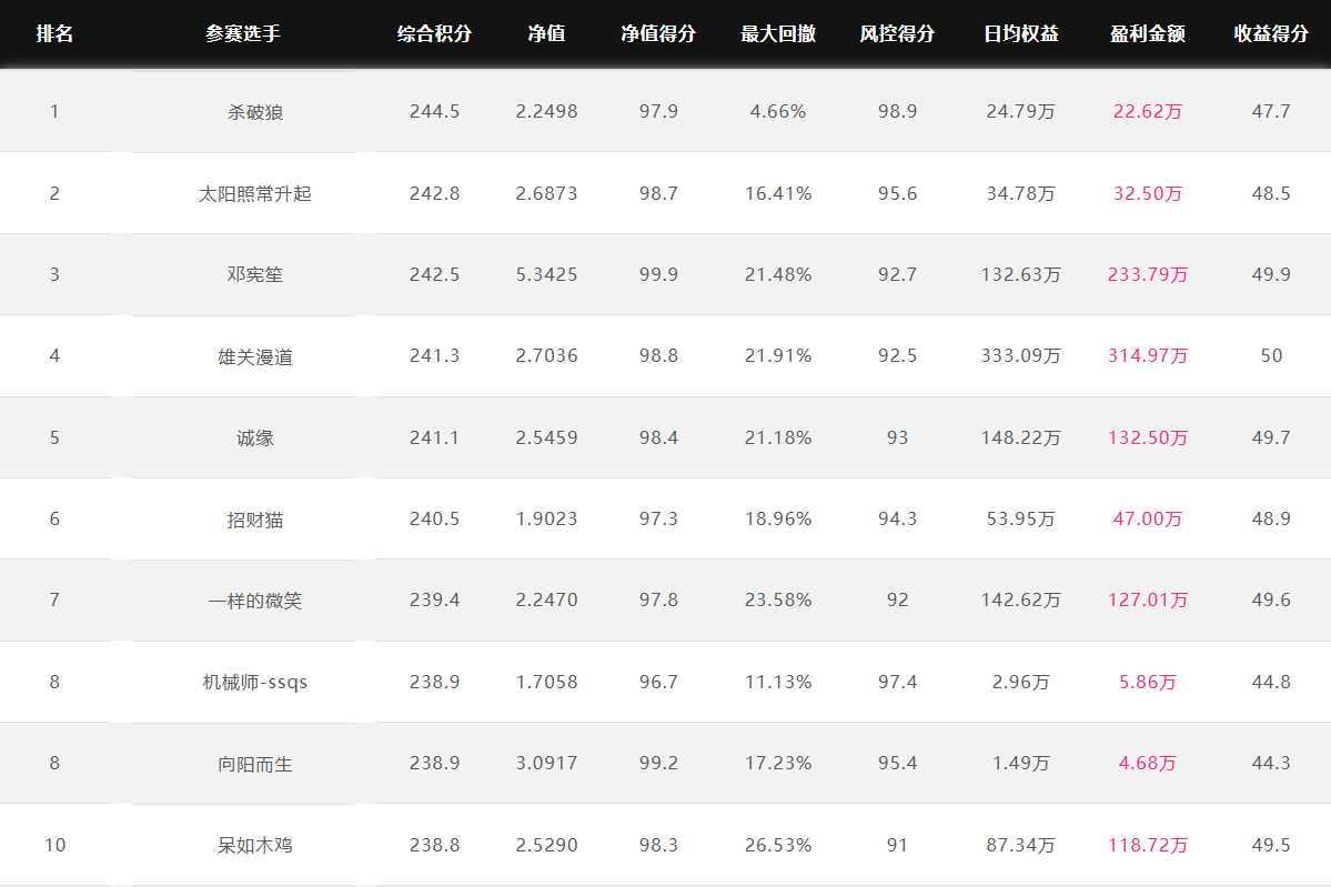 奖金上不封顶 特定期货公司参赛奖金翻倍 优秀选投 每周选优秀选手对接资金 达标必投 单笔最多给1个亿管理型资金 管理型资金盈利分成20%~70% 免费培训/研报/调研/咨询 诚邀您参赛! 为了促进国内期货市场交易人才的发展和成熟,七禾网举办本次“期货CTA英雄联盟”实盘大赛&超级服务,招募优秀的操盘手,为优秀的交易人才搭建桥梁! 第四届大赛圆满结束,第五届荣耀开启,欢迎参赛!第五届大赛已于2025年7月1日开赛,火热报名中,比赛过程中持续接受报名,大赛奖金&管理型资金&超级服务,等你来领! 2023年2月16日后,在主办方指定的几家期货公司中的某一家C公司新开户参赛,享奖金翻倍! 在主办方指定的几家期货公司中的某一家B公司新开户参赛,享奖金翻倍! 大赛中的优秀选手,只要在大赛中有3个月及以上的实盘业绩,主办方将每周发送优秀参赛者的业绩、资料给合作的数十家资方,供其考察是否投管理型资金。至2022年8月12日,资方已选出23名优秀投顾,累计投入超5.5亿元管理型资金。 优秀选投:通过主办方及资方考核后,将获得管理型资金(资金来源:七禾网自有资金(买优秀选手的基金产品)、七禾网股东、数十家合作资方) 在主办方指定的几家期货公司中的某一家B公司新开户参赛,以及2023年2月16日后,在主办方指定的几家期货公司中的某一家C公司新开户参赛,可以按照:“达标必投”进行考核(将给予单笔100万元~1亿元的管理型资金,分红比例20%~70%),详细规则请联系微信:15858201632 大赛综合排名前10名 2026.1.9