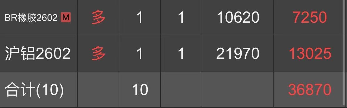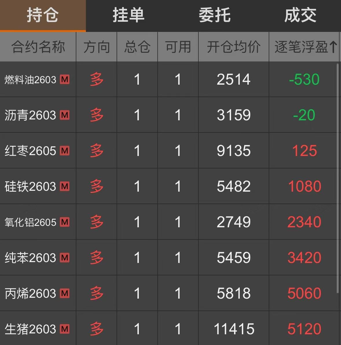 | 一、开仓总结 沪铝:2025年12月9日,达到启动点的开仓条件,所以在14:57开多一手沪铝2601合约,开仓价为21775。沪铝2601合约于2025年12月10日21:05移仓至主力合约2602,开仓价为21970。 BR橡胶:2025年12月10日,达到启动点的开仓条件,所以在14:49开多一手BR橡胶2602合约,开仓价为10620。 硅铁:2025年12月16日,达到启动点的开仓条件,所以在14:53开多一手硅铁2603合约,开仓价为5482。 生猪:2025年12月17日,达到启动点的开仓条件,所以在09:00开多一手生猪2603合约,开仓价为11415。 沥青:2025年12月17日,达到启动点的开仓条件,所以在14:52开多一手沥青2602合约,开仓价为2995。沥青2602合约于2026年1月6日21:17移仓至主力合约2603,开仓价为3159。 氧化铝:2025年12月30日,达到启动点的开仓条件,所以在14:47开多一手氧化铝2605合约,开仓价为2749。 丙烯:2025年12月30日,达到启动点的开仓条件,所以在14:49开多一手丙烯2603合约,开仓价为5818。 红枣:2026年1月7日,达到启动点的开仓条件,所以在14:45开多一手红枣2605合约,开仓价为9135。 原木:2026年1月7日,达到启动点的开仓条件,所以在14:45开多一手原木2603合约,开仓价为780.5。 纯苯:2026年1月7日,达到启动点的开仓条件,所以在14:54开多一手纯苯2603合约,开仓价为5459。 燃料油:2026年1月9日,达到启动点的开仓条件,所以在14:56开多一手燃料油2603合约,开仓价为2514。 二、平仓计划 沪铝:达到启动点的平仓止损/止盈条件,在收盘前或下一个交易日开盘后全部平仓。 BR橡胶:达到启动点的平仓止损/止盈条件,在收盘前或下一个交易日开盘后全部平仓。 硅铁:达到启动点的平仓止损/止盈条件,在收盘前或下一个交易日开盘后全部平仓。 生猪:达到启动点的平仓止损/止盈条件,在收盘前或下一个交易日开盘后全部平仓。 沥青:达到启动点的平仓止损/止盈条件,在收盘前或下一个交易日开盘后全部平仓。 氧化铝:达到启动点的平仓止损/止盈条件,在收盘前或下一个交易日开盘后全部平仓。 丙烯:达到启动点的平仓止损/止盈条件,在收盘前或下一个交易日开盘后全部平仓。 红枣:达到启动点的平仓止损/止盈条件,在收盘前或下一个交易日开盘后全部平仓。 原木:达到启动点的平仓止损/止盈条件,已于2026年1月12日14:59平仓,平仓价为773.5,平仓亏损630元。
