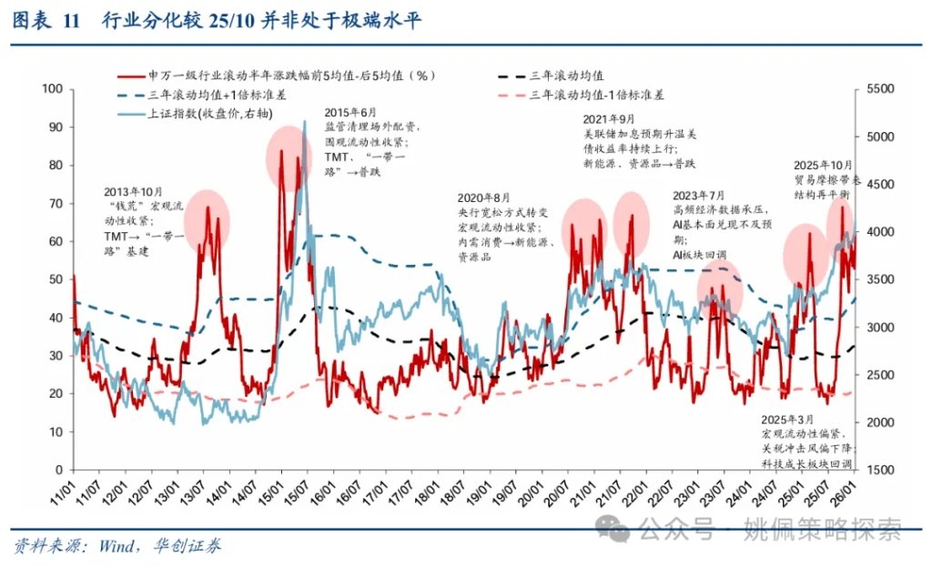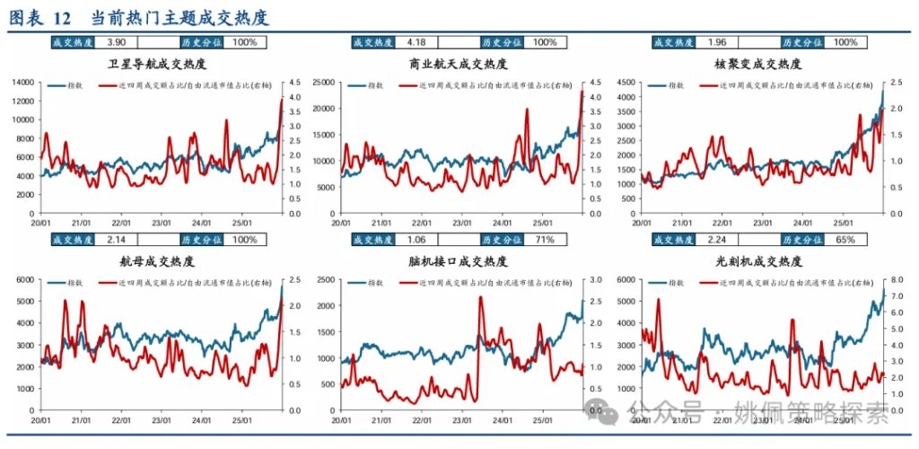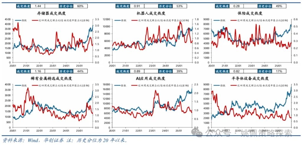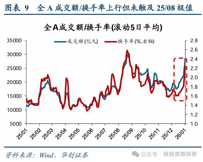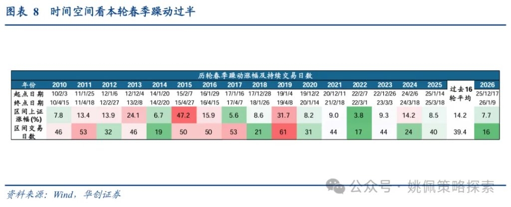 二、春季躁动仍具延续的现实基础 我们认为从基本面视角来看,春季躁动有望延续。基本面信号主要来自于地产政策与价格改善。地产方面,我们已在前期周报《躁动主线与扩散——策略周聚焦》、《大类资产年关盘点——策略周聚焦》、《储备躁动品种——策略周聚焦》、《躁动题眼,还在地产——策略周聚焦》中详细论述过春季躁动的核心依然在于地产,在我们报告发出后稳地产政策频繁推出,对市场风险偏好形成支撑:万科债券展期虽未获得通过,但宽限期从5个工作日延长为30个交易日至1/28;12/24日北京市住建委对限购、商贷及公积金政策进行优化;12/30财政部、税务总局将未满2年住房销售增值税征收率从5%下调至3%,有助于地产去库存;1/1起公积金贷款利率正式执行下调0.25pct后的利率2.6%;1/1《求是》杂志刊发《改善和稳定房地产市场预期》,据我们统计这是过去十年间该杂志首次在单篇完整文章中专门讨论房地产问题,其中强调房地产带有显著的金融资产属性、仍然是支撑国民经济的基础产业,明确提出“政策要一次性给足,不能采取添油战术”,同时也关注到当前地产债务仍然较高的问题、提出需有效应对个别房企破产重组的可能。另一方面,PPI降幅持续收窄验证了我们自7月以来对反内卷推动牛市主驱动由上半场流动性驱动的金融再通胀转向下半场由EPS驱动的实物再通胀的看法,全年视角下再通胀与业绩修复仍是重要线索,短期内价格持续改善支撑春季躁动的延续;具体数据上,PPI环比已连续三月转正(25/10、25/11 0.1%、25/12 0.2%)、PPI同比降幅也持续收窄(由25/07的-3.6%回升至25/12的-1.9%),价格端超预期改善。 本轮春季躁动行情过半,十六连阳下的时间空间均有半成余量,交易未极端过热。结合历史春季躁动的节奏来看本轮行情在涨幅和持续天数上或仍有空间,我们统计2010年以来的各轮春季躁动,相对过去16轮躁动中上证平均涨幅14.2%、持续交易日数39天,当前上证涨幅7.7%、持续16日依然存在约半成余量。同时根据我们在《A股十四连阳,躁动几成热?》中的讨论,从四个视角衡量当前十六连阳下的交易指标并未极端过热:①截至1/9全A成交额3.15万亿、换手率2.4%,较8月底峰值3.2万亿/2.8%仍存空间,且8月底峰值水平并不代表该值一定为本轮牛市峰值;②申万一级行业滚动半年涨跌幅前5均值-后5均值达62%,较10月初69%,当前行业分化未达到极端水平;③以“近4周成交额占全A比例/自由流通市值占全A比例”衡量热门主题赛道交易热度,其中仅商业航天/卫星导航/核聚变/航母成交热度居历史高点,相比之下脑机接口(当前成交热度分位71%,下同)、机器人53%、保险49%、稀有金属44%、AI应用39%、半导体设备17%等仍处历史中低位;④前述我们提到两融为主要增量资金,成交占比虽已上升至11%,但较前期10/9高点的13%仍存差距。