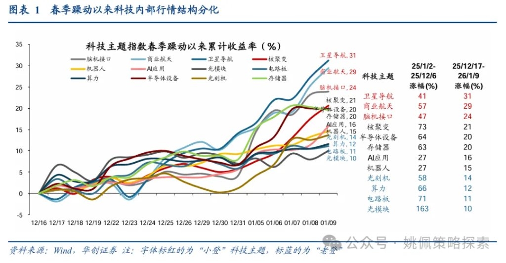 | 一、科技内部的“老登”“小登”之争 科技的“老登”“小登”之争背后是增量与存量资金在“共识增长”与“非共识增长”方向上的再平衡。我们观察到本轮春季躁动在科技内部已形成分化,我们认为这并非由于科技“老登”的基本面走弱,而是“老登”进入以业绩兑现消化估值的等待阶段,节奏上暂时让位于“小登”,其估值进一步扩张或需等待4月财报季验证。在此之前,新入市资金并不倾向于继续推升已高度拥挤的资产,而更愿意在尚未形成抱团的领域寻找新的定价空间。具体的分化情况上,以万得概念指数为例,25年领涨的“老登”主题如算力、PCB、CPO,25/1/2-25/12/16涨幅分别为66%、71%、163%,而12/17以来涨幅仅分别为12%、11%、10%,不及“小登”主题本轮春季躁动收益,如卫星导航31%、商业航天29%、脑机接口24%,这与我们在《牛市下半场,实物再通胀——2026年度投资策略》中提示的操作风险一致,即过去一年中,以算力、CPO、PCB为代表的科技主线在机构资金持续加仓下已形成高度一致预期,截至25Q3基金持仓占比前3行业(电子26%、电新12%、医药10%)合计持仓占比达48%,已触及21Q2峰值48%,而历史经验表明达峰值后一年大幅超配的行业往往很难持续贡献显著超额收益,其在配置层面的边际吸引力开始下降,科技板块内部由此出现结构切换。