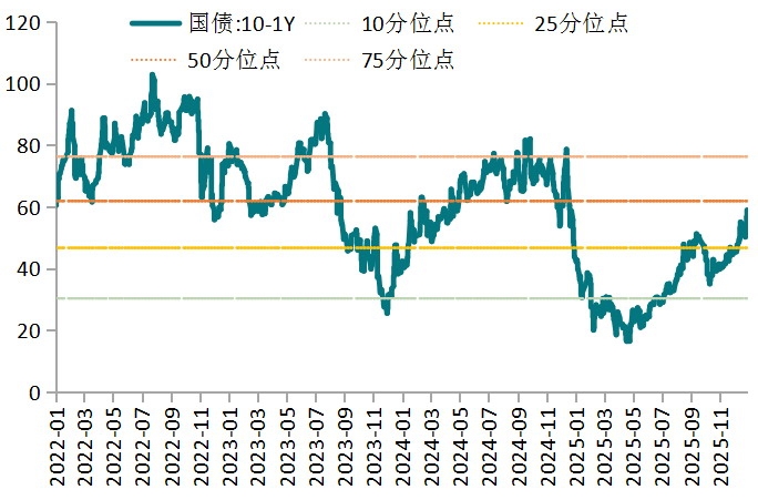 图为资金利率走势(单位:%) 预计在经济新动能、出口端有韧性以及价格修复带来的宏观环境积极背景下,叠加“十五五”开局政策有加码预期,经济数据环比有望继续修复。在供需再平衡的政策要求下,价格端有望企稳回升,将支撑名义GDP增长率初步修复。不过,当前需求驱动特征仍不明显,需要政策端持续加力。 短端债市表现偏强,主要源于资金面持续宽松和债券投资机构主动缩短投资组合的久期。2025年12月以来,资金利率中枢持续下行,近期DR001基本围绕1.27%震荡,R001的均值也从此前的1.4%~1.5%降至1.35%左右,跨年后央行连续大额回笼资金,但流动性宽松格局未变。资金面宽松提升机构在短端债市加杠杆的热情,质押式回购成交量攀升,叠加长债市场持续承压,机构纷纷缩短投资组合的久期来规避风险,短债需求大幅增加。 展望后市,1月在银行信贷投放高峰、地方债发行高峰及缴税大月带来显著财政存款净回笼,以及春节前取现需求增加等因素影响下,不同期限资金利率差或有所收敛。不过,货币政策仍是关键,在“适度宽松”的政策基调以及“灵活高效运用降准降息”的定位下,央行呵护资金面态度不改,春节前通过降准操作补充市场中长期流动性的概率仍然较高。因此,资金利率中枢大概率维持低位,而税期前后和月末时点资金面或有所收紧。 短期看,资金面略有扰动,但供求、基本面及机构行为仍利好短端债市。预计在资金面宽松、利率债供给中长久期占比更高,以及经济实现“开门红”概率较高的背景下,短债需求格局仍然好于长端,收益率曲线维持偏陡峭格局。1月至2月通常被视为政策真空期,市场对长端债市的担忧难以消除,且在银行指标偏紧和负债端稳定性不足背景下,中短端利率债仍占优,机构短端套息需求较旺盛。 不过,长端债市进一步调整的空间逐步收窄。目前30年期和10年期、10年期和1年期国债利差已分别回到40BP和60BP附近,进入合理区间,同时随着10年期国债收益率再度达到1.9%整数关口,一定程度上打开了配置空间。当前经济内生动能仍然不强,利率进一步上行的空间受限,债市一度出现反弹修复动能。若后续随着央行降准降息预期升温、股市调整带来资金避险需求、宏观政策真空期过后市场重回基本面定价,债市可能出现做多机会。