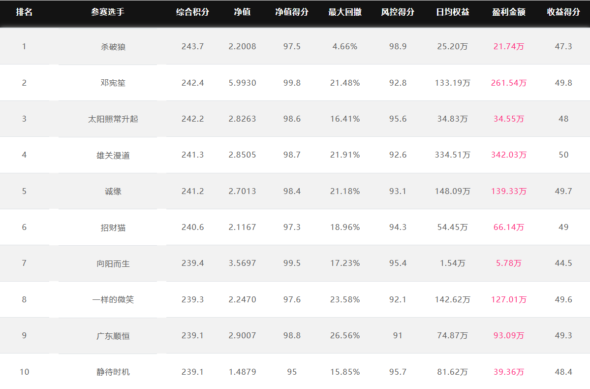 奖金上不封顶 特定期货公司参赛奖金翻倍 优秀选投 每周选优秀选手对接资金 达标必投 单笔最多给1个亿管理型资金 管理型资金盈利分成20%~70% 免费培训/研报/调研/咨询 诚邀您参赛! 为了促进国内期货市场交易人才的发展和成熟,七禾网举办本次“期货CTA英雄联盟”实盘大赛&超级服务,招募优秀的操盘手,为优秀的交易人才搭建桥梁! 第四届大赛圆满结束,第五届荣耀开启,欢迎参赛!第五届大赛已于2025年7月1日开赛,火热报名中,比赛过程中持续接受报名,大赛奖金&管理型资金&超级服务,等你来领! 2023年2月16日后,在主办方指定的几家期货公司中的某一家C公司新开户参赛,享奖金翻倍! 在主办方指定的几家期货公司中的某一家B公司新开户参赛,享奖金翻倍! 大赛中的优秀选手,只要在大赛中有3个月及以上的实盘业绩,主办方将每周发送优秀参赛者的业绩、资料给合作的数十家资方,供其考察是否投管理型资金。至2022年8月12日,资方已选出23名优秀投顾,累计投入超5.5亿元管理型资金。 优秀选投:通过主办方及资方考核后,将获得管理型资金(资金来源:七禾网自有资金(买优秀选手的基金产品)、七禾网股东、数十家合作资方) 在主办方指定的几家期货公司中的某一家B公司新开户参赛,以及2023年2月16日后,在主办方指定的几家期货公司中的某一家C公司新开户参赛,可以按照:“达标必投”进行考核(将给予单笔100万元~1亿元的管理型资金,分红比例20%~70%),详细规则请联系微信:15858201632 大赛综合排名前10名 2026.1.12