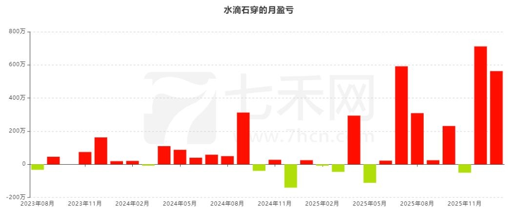 从月盈亏图来看,账户“水滴石穿”共计交易30个月的时间,盈利22个月,亏损8个月。盈利最多的月份是2025年12月,盈利金额为711.73万。