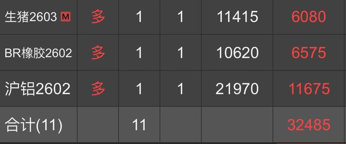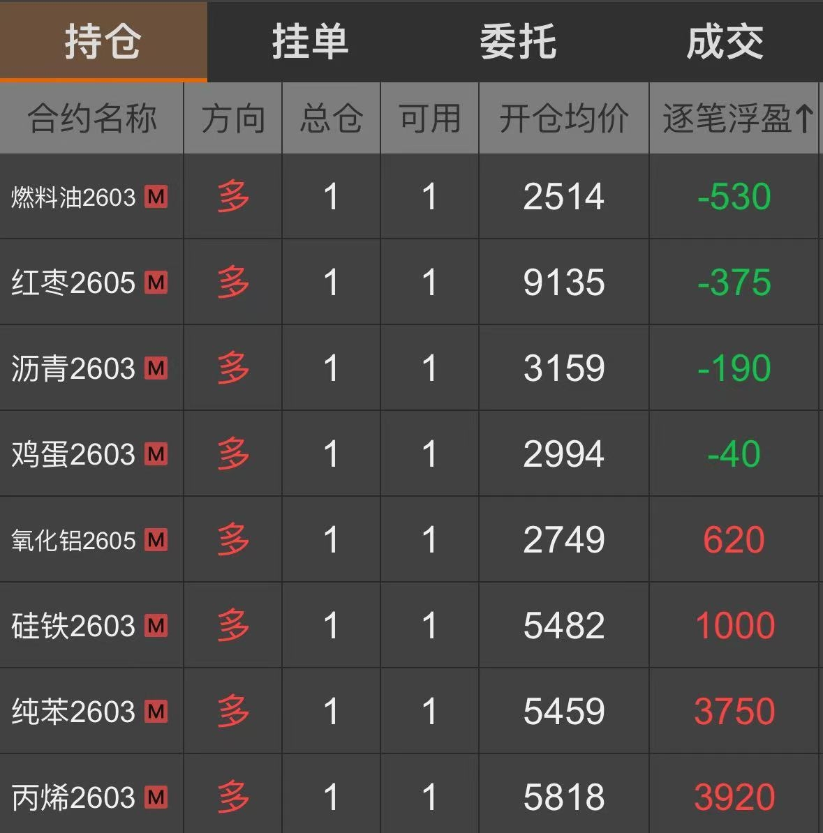 | 一、开仓总结 沪铝:2025年12月9日,达到启动点的开仓条件,所以在14:57开多一手沪铝2601合约,开仓价为21775。沪铝2601合约于2025年12月10日21:05移仓至主力合约2602,开仓价为21970。 BR橡胶:2025年12月10日,达到启动点的开仓条件,所以在14:49开多一手BR橡胶2602合约,开仓价为10620。 硅铁:2025年12月16日,达到启动点的开仓条件,所以在14:53开多一手硅铁2603合约,开仓价为5482。 生猪:2025年12月17日,达到启动点的开仓条件,所以在09:00开多一手生猪2603合约,开仓价为11415。 沥青:2025年12月17日,达到启动点的开仓条件,所以在14:52开多一手沥青2602合约,开仓价为2995。沥青2602合约于2026年1月6日21:17移仓至主力合约2603,开仓价为3159。 氧化铝:2025年12月30日,达到启动点的开仓条件,所以在14:47开多一手氧化铝2605合约,开仓价为2749。 丙烯:2025年12月30日,达到启动点的开仓条件,所以在14:49开多一手丙烯2603合约,开仓价为5818。 红枣:2026年1月7日,达到启动点的开仓条件,所以在14:45开多一手红枣2605合约,开仓价为9135。 纯苯:2026年1月7日,达到启动点的开仓条件,所以在14:54开多一手纯苯2603合约,开仓价为5459。 燃料油:2026年1月9日,达到启动点的开仓条件,所以在14:56开多一手燃料油2603合约,开仓价为2514。 鸡蛋:2026年1月13日,达到启动点的开仓条件,所以在14:50开多一手鸡蛋2603合约,开仓价为2994。