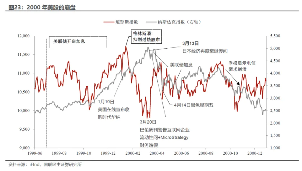 更深一层,为什么会出现这样无序膨胀的资本“肿瘤”?我们觉得有以下几方面的原因: 一是畸形的企业激励。一方面科技公司高管有大量的股票期权激励,和公司股票挂钩;另一方面,按照当时的会计准则,股票期权不作为企业费用核算(2006年开始强制要求上市公司必须将股票期权的价值计算为费用,并从利润中扣除)。 二是金融监管的松动和漏洞,金融机构推波助澜。 政策层面,1994年签署的《Riegle-Neal跨州银行法》打破了区域限制,直接推动了美国银行业的大规模并购浪潮,1999年进一步通过《金融服务现代化法案》,结束了对金融混业经营的禁止,但在此之前混业已经逐步形成风气,比较典型是1998年4月花旗公司(银行)和旅行者集团(保险、投行)宣布合并。金融扩张意愿高涨、竞争加剧,金融创新涌现; 机构方面,投行分析师激进的评级起到了“推波助澜”的重要作用。根据Patricia C. O’Brien,Yao Tian(2006),从1998年开始分析师给予互联网股票的推荐评级高于其他新股,而且这种关系在互联网股票上市(IPO)当年尤为明显。 第三是企业内控不严,给财务操作留下很大空间。例如朗讯等电信设备公司,利用供应商融资销售,在商品交付时即确认为收入,而把客户的信用和回款风险后移,举例来说: 电信设备公司L向一家财务困难的服务商A提供美元融资额度 → 服务商A当期利用额度赊账向L购买X美元的电信设备 → 设备公司L当季即确认X美元收入(虽然并没有收到回款),EPS上升 → 股价上涨,CEO奖金增加,期权价值增长→两年后,服务商A申请破产,公司L无法收回款项 → 公司L被迫为坏账设立拨备、调减收入。 2000年:谁拿走了酒杯?谁雪上加霜? 打响第一枪的还是美联储。2000年1月13日格林斯潘在纽约经济俱乐部发表讲话(1月14日刊发),转向旗帜鲜明的抑制“股市过热”,核心的逻辑是股市上涨的财富效应会带来需求激增、威胁通胀稳定。同日,道琼斯指数触顶。随后美联储在2月、3月和5月连续加息。 而科技股的见顶以及后续的暴跌是在这样的背景下逐步展开的。在流动性边际收紧的情况下,负面信息的冲击往往会被放大: 纳指在3月10日、周五触及高点。而接下来的周一(3月13日),日本经济再度衰退的新闻不胫而走,股市开始暴跌。但可能更重要的是,格林斯潘的货币政策框架可能又发生了变化,这一次并没有因为日本的原因再度暂停加息甚至降息,更加专注治理国内已经抬头的通胀。 然后行业和公司层面的风险不断出现,导致4月暴跌: 3月20日,巴伦周刊发表一篇名为"Burning Up"的封面故事,深入分析了207家互联网公司的财务状况。犀利地指出其中至少51家公司的现金储备将在12个月内耗尽,许多公司完全没有盈利的希望。无独有偶,同日当时还是互联网公司的MicroStrategy(如今是数字货币公司)通过财务虚增收入,股价一日暴跌62%。 4月3日,则是经常被视为刺破泡沫重要事件的微软反垄断案。微软败诉开始让法律界质疑“新经济”的商业模式。作为纳指权重股的微软当日下跌14%。 最终整体利空的情绪积聚带来了4月14日的“黑色星期五”,纳指单日下跌9%,整周下跌25%。 最重要的是“格林斯潘PUT”并没有出现,而随着股价大跌,我们之前说的恶性循环开始发挥作用: 2000年中期开始,高债务的电信服务商开始出现成片的破产(Covad、Focal Communications、McLeod、Northpoint和WinStar等),朗讯、思科等财务风险开始暴露。而后就进入,减值确认、融资冻结、评级下调的恶性循环。 随后的财报逐步显示电信需求崩溃,投资过剩担忧开始显现,企业财务丑闻频发。 至此作为科网泡沫“压舱石”的电信设备生产商陷入亏损、财务造假的泥淖,曾经风光一时的朗讯破产。而没了投资扩张的故事支撑,互联网企业的现金流问题也被无限放大。